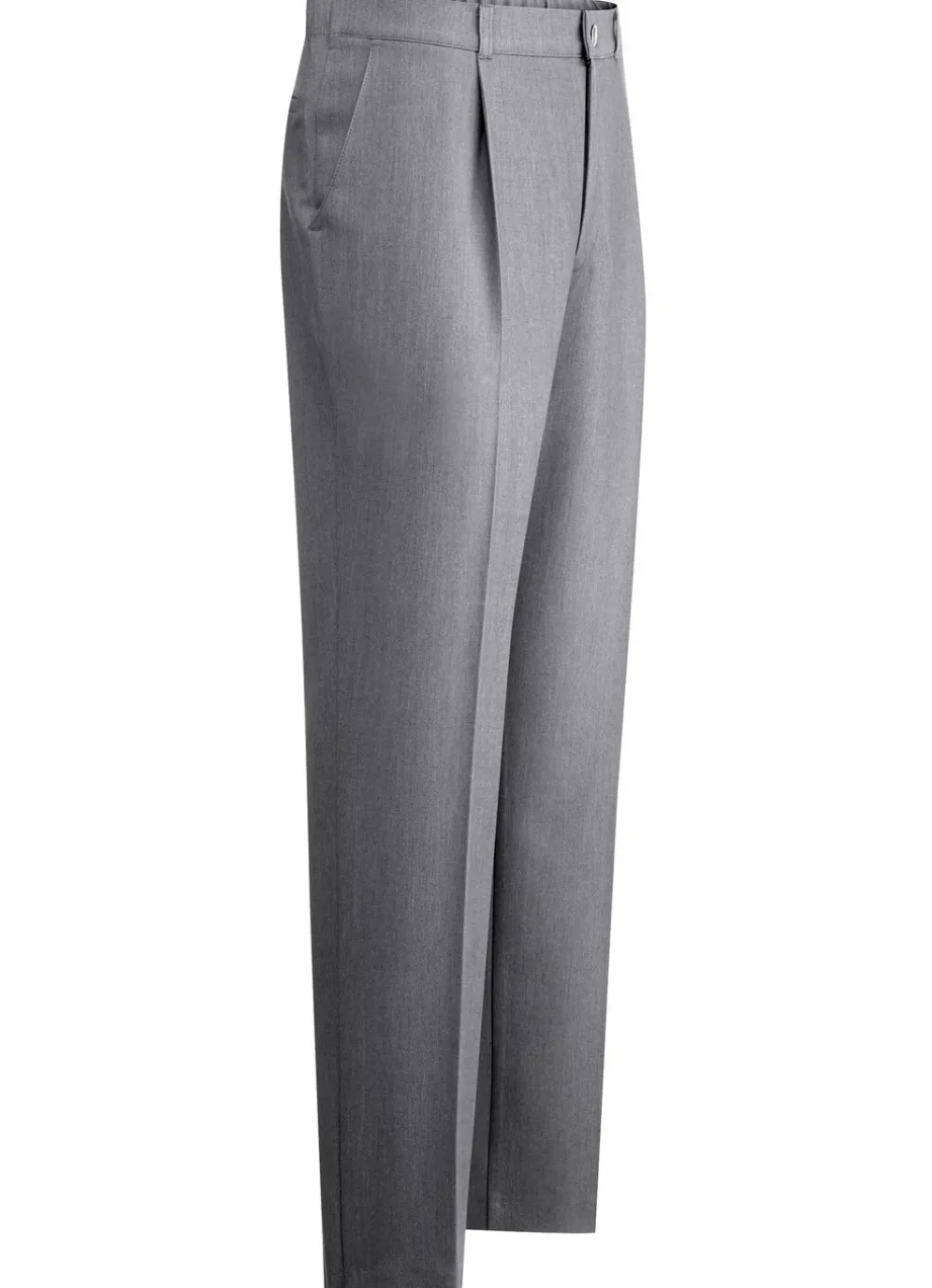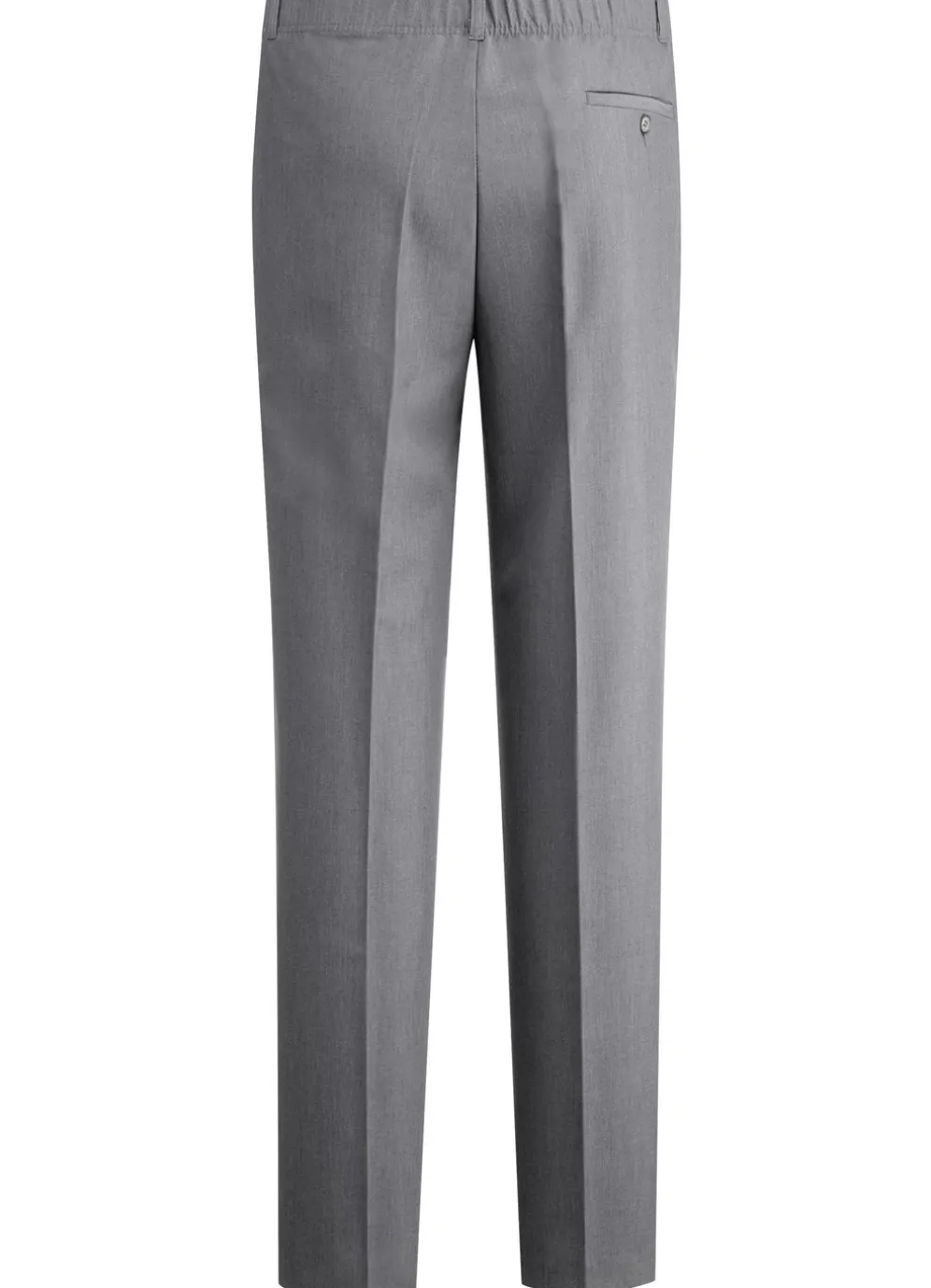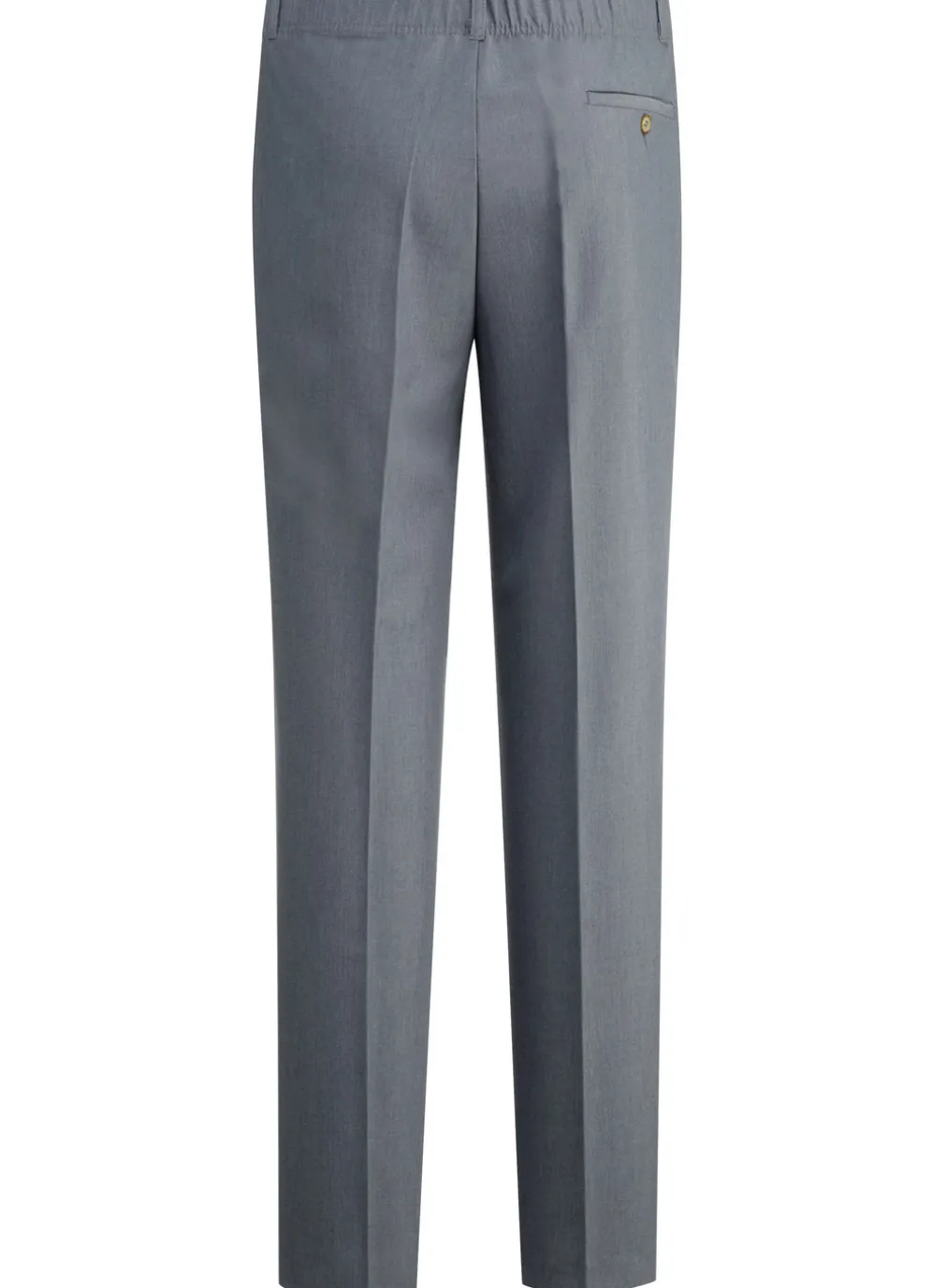 Modische Hose mit Bundfalten, Seitentaschen, Dehnbund im Rückteil sowie Gesäßpaspeltasche mit Knopfverschluss.