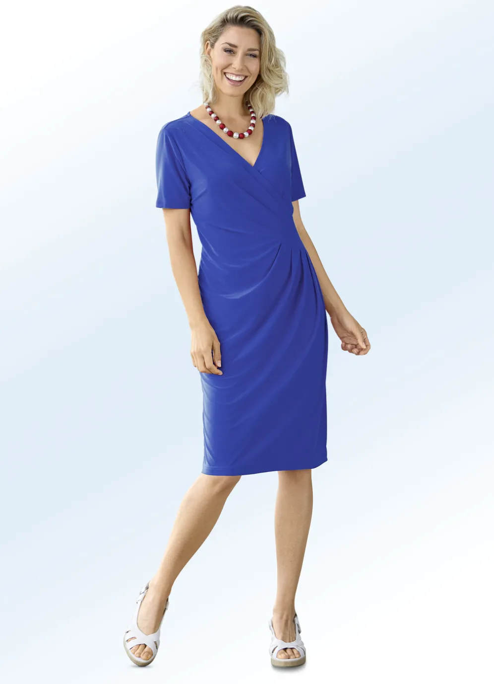 Ein echter Blickfang ist dieses elegante Kleid in leicht taillierter Schlupfform, mit V-Ausschnitt, kurzen Ärmeln, Wickeloptik im Vorderteil sowie raffiniertem Einsatz im Taillenbereich mit schicker Faltenlegung.