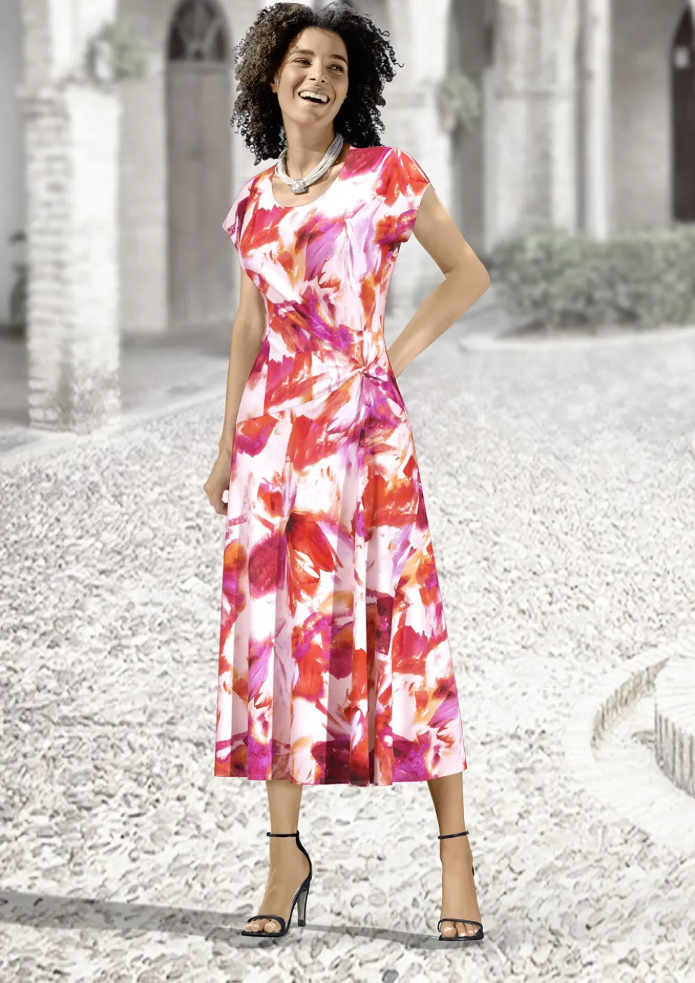 Feminines, koralle-pink-ecru-buntes Kleid in leicht taillierter Schlupfform, mit farbbrillantem Druck, rundem Halsausschnitt, überschnittener Schulterpartie, raffinierter Knotentechnik im Vorderteil sowie asymmetrisch angesetztem, ausgestelltem Rockteil.