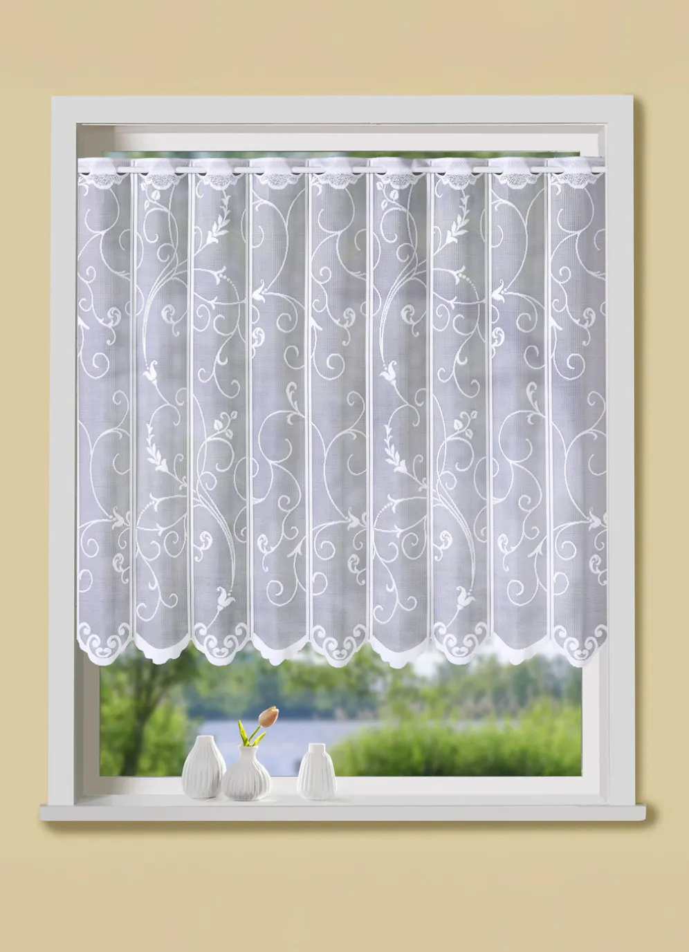 Dieser schöne Kleinfenster-Store mit gebogtem Abschluss und Stangendurchzug besticht durch sein zeitloses Design. Die Qualität: Jacquard aus 100% Polyester.