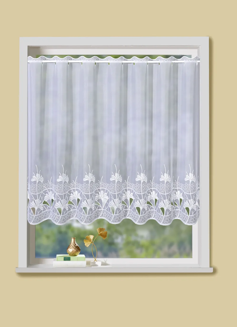 Dieser Kleinfenster-Store mit ansprechendem Ginko-Motiv, echter Plauener-Stickerei, gewelltem Abschluss und Stangendurchzug sorgt für spürbar mehr Wohnlichkeit. Die Qualität: 100% Polyester