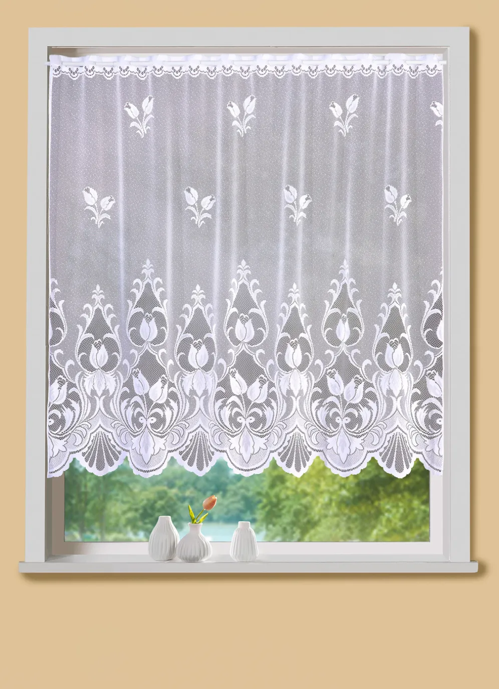 Ein klassisch schöner Kleinfenster-Store mit reichhaltiger, floraler Dessinierung, die durch die kleinen Verzierungen perfekt abgerundet wird. Der muschelförmig ausgebogte Abschluss verleiht zusätzlich ein auffallendes, optisches Augenmerk. Mit Stangendurchzug.