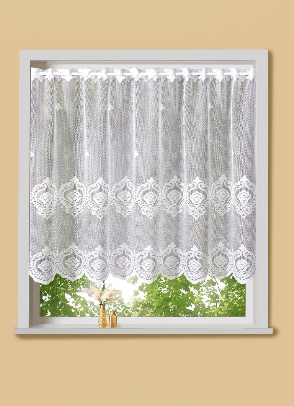 Hinreißender Kleinfenster-Store mit Stangendurchzug für das besondere Ambiente in Ihrem Zuhause! Mit tollen Ornamenten und gebogten Abschlüssen. Die Qualität: Jacquard, 100% Polyester
