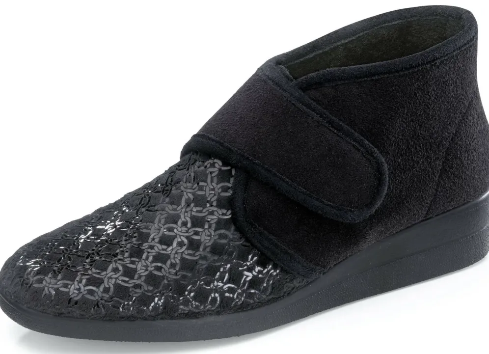 Klett-Hausschuh aus teilweise glänzend bedrucktem, elastischem Veloursmaterial: Textilfutter, gepolstertes Fußbett, superleichte Gummi-Riffelsohle sowie 25 mm Keilabsatz