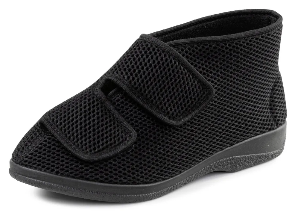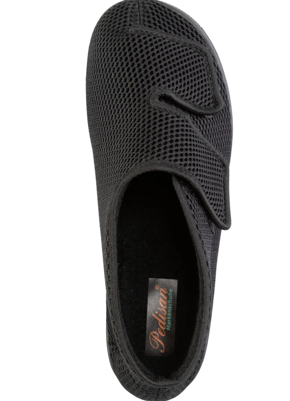 Komfortabler, schwarzer Klettschuh aus elastischem Textilmaterial: gepolstertes Futter und Decksohle aus angenehmem Frottee, leichte Synthetik-Laufsohle