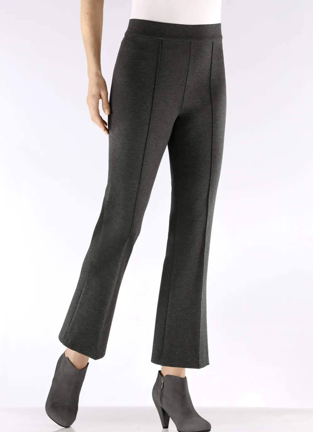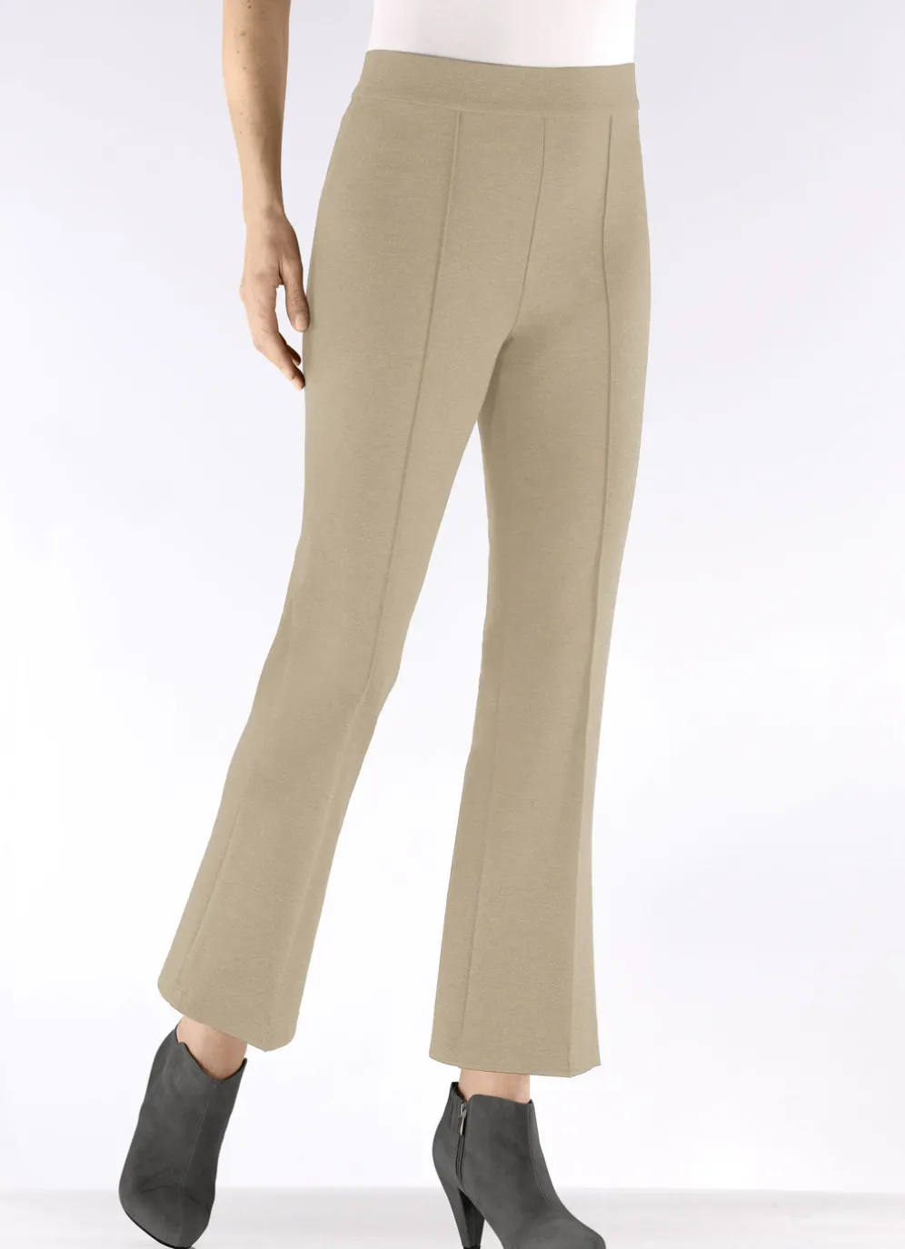 Ihr Modell BECKY – knöchellange Hose in bequemer Schlupfform, glatt anliegend dank des innenliegenden, unsichtbaren Rundum-Dehnbundes sowie streckende, abgesteppte Biesen im Vorderteil. Innenbeinlänge ca. 71 cm, Fußweite ab 46 cm. die Qualität: bi-elastischer Romanit-Jersey aus 65% Viskose, 30% Polyamid und 5% Elasthan