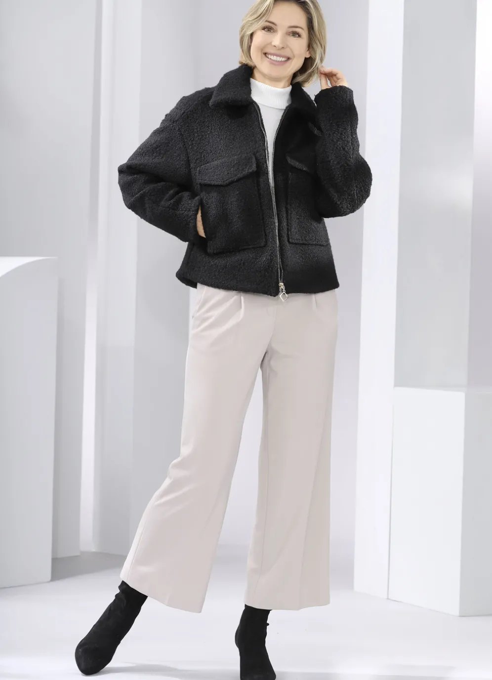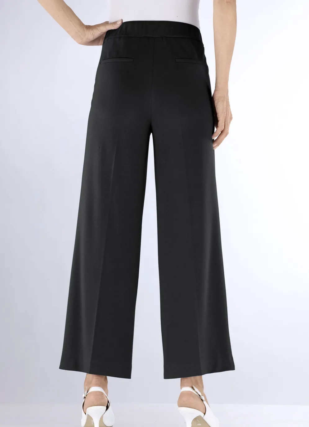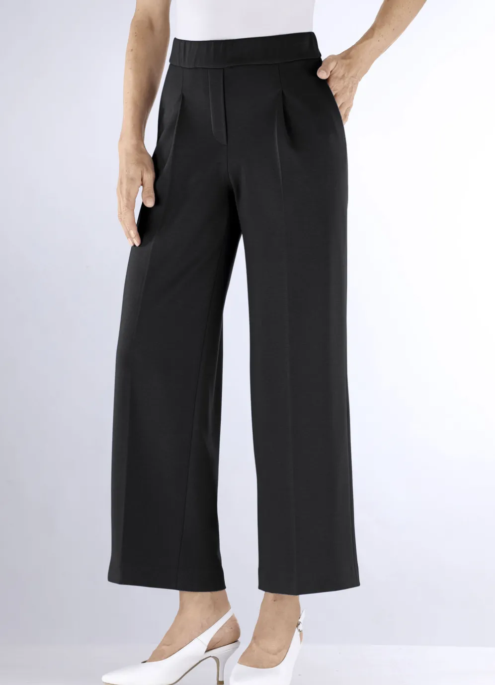 Fabelhafte, knöchellange Hose mit luftig weitem Bein: Schlupfform, glatt anliegend dank der innenliegenden Gummibund-Einlage, Reißverschluss-Zierblende, Seitentaschen sowie Bundfalten. Innenbeinlänge ca. 71 cm, Fußweite ab 58 cm.