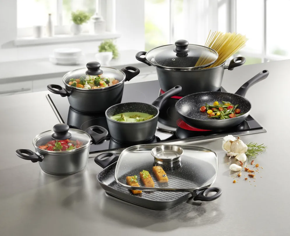 Kochtopf-Set 10-teilig mit megaharter Antihaftbeschichtung in Anthrazit.