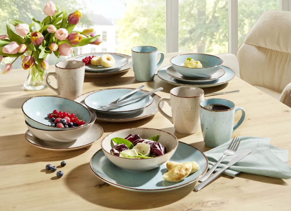 Kombi-Service, 16-teilig, aus Feinsteinzeug im Natur-Look in Beige-Türkis.