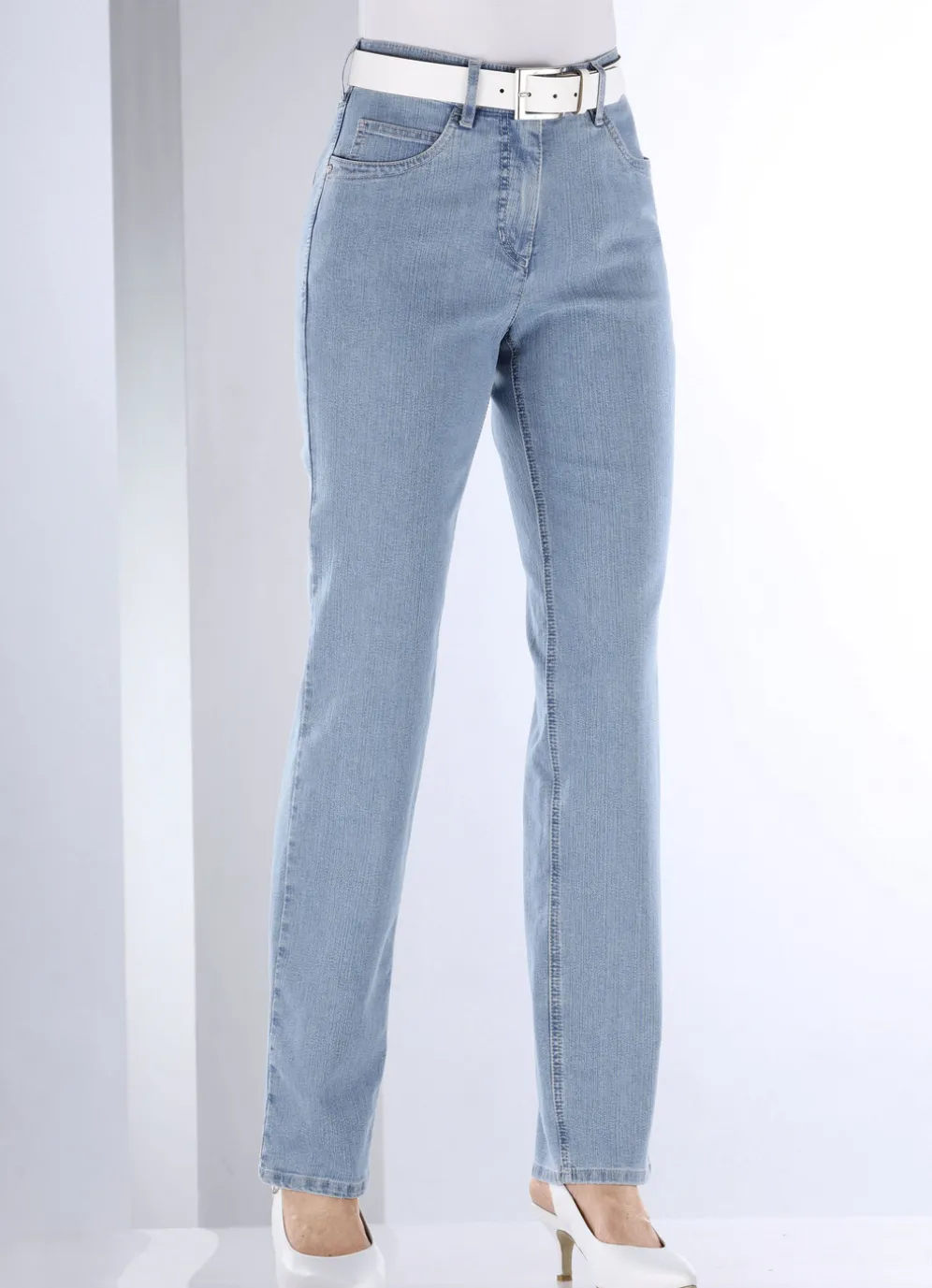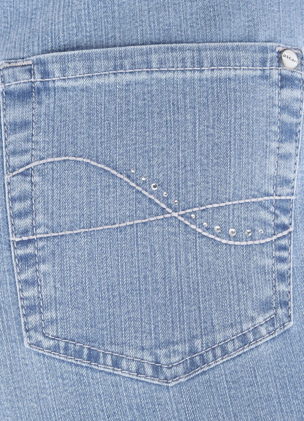 Ihr Modell CARLA – für hohen Tragekomfort sorgt diese attraktive Komfortjeans in 5-Pocket-Form: elastischer Formbund, Gürtelschlaufen, Knopf- und Reißverschluss sowie schöne, kontrastfarbene Stickerei, verziert mit Strasssteinen an den aufgesetzten Gesäßtaschen, Jeanssattel und dezente Auswascheffekte. Innenbeinlänge ca. 77 cm, Fußweite ab 37 cm.