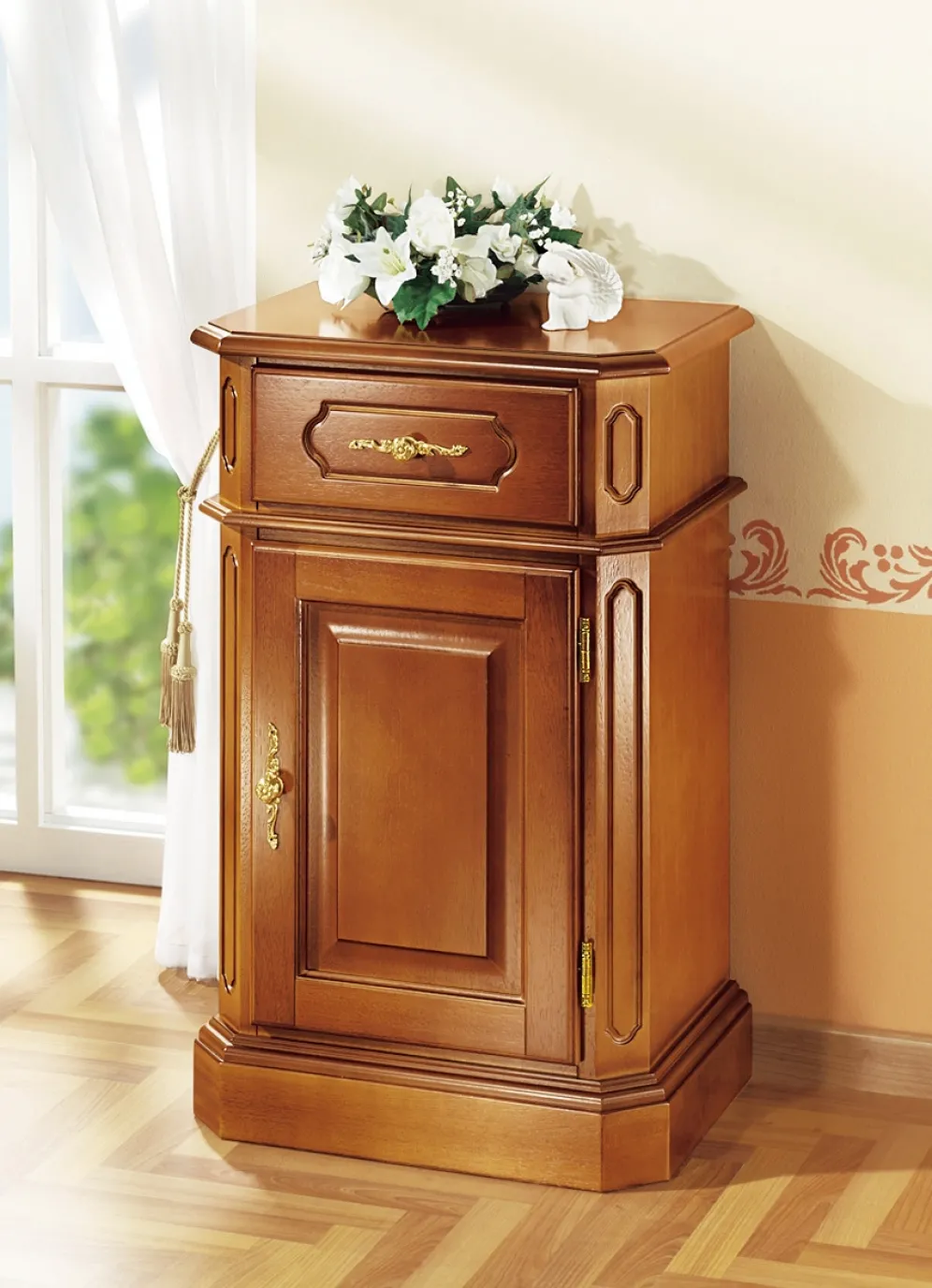 Stilvolles, teilmassives Möbelprogramm, wahlweise in Nussbaum- oder Kirschbaum-Dekor. Mit eleganten, goldfarbenen Metallgriffen. Die Lieferung erfolgt aufgebaut.