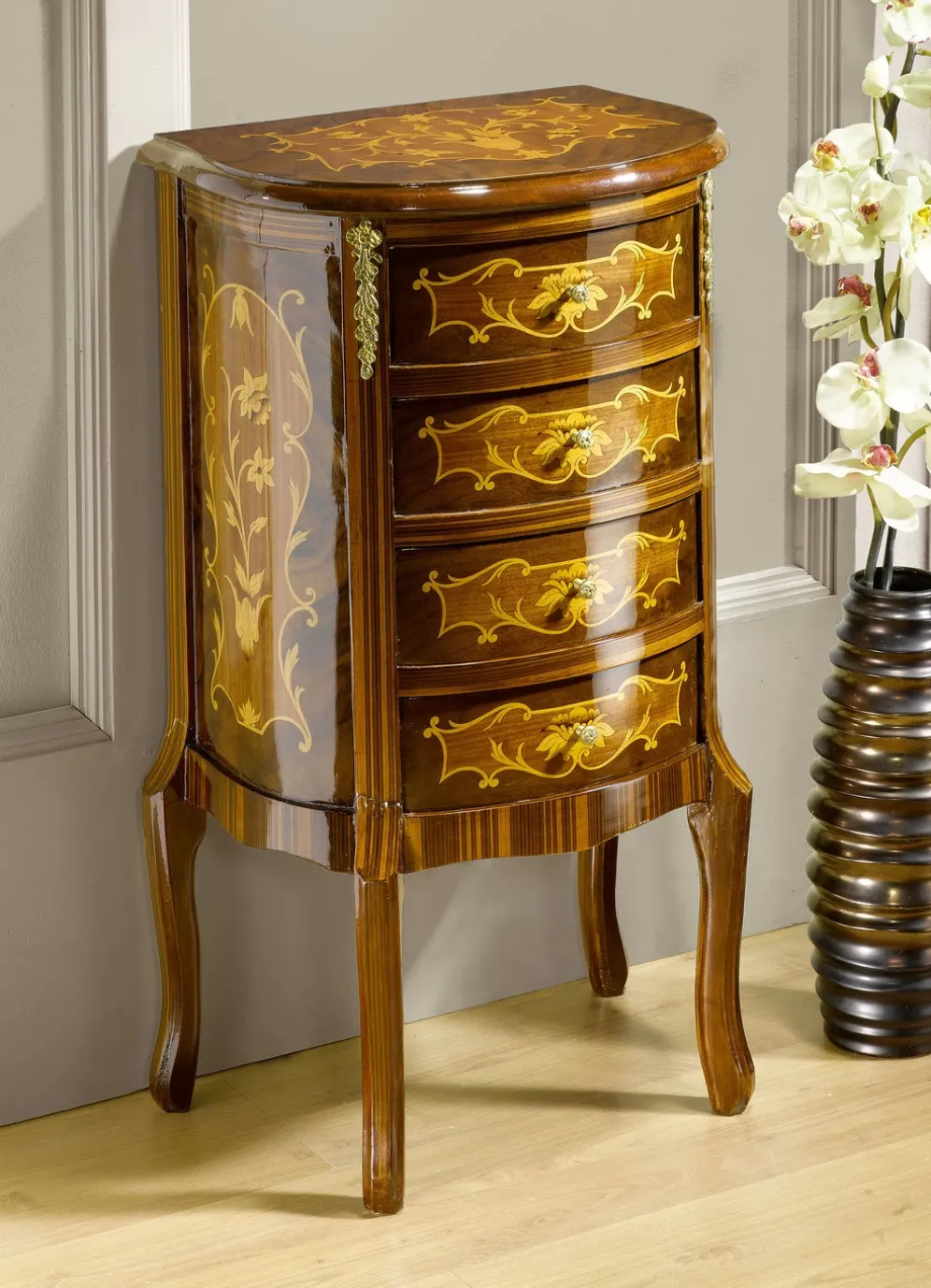 Kunstvoll verzierte Kommode aus massivem Buchenholz! Mit schönen Intarsien auf der Deckplatte, den Schubladen und den Seitenteilen, goldfarbenen Verzierungen sowie 4 Schubladen mit goldfarbenen Metallgriffen. Auf geschwungenen Beinen.