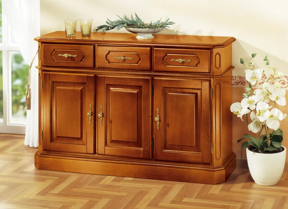 Stilvolle, teilmassive Kommoden, wahlweise in Nussbaum- oder Kirschbaumdekor. mit eleganten, goldfarbenen Metallgriffen. Lieferung erfolgt aufgebaut.