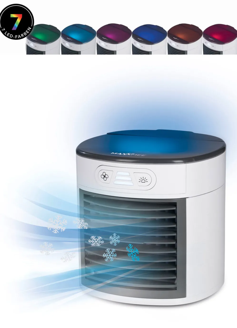 Der kompakte Luftkühler, 3-in-1 kühlt, befeuchtet und reinigt die Luft in Ihrer Umgebung. Er säubert und befreit die Raumluft mit Hilfe von UV-C-Licht bis zu 99,9% von Keimen und Bakterien. Kühlt natürlich durch Verdunstung von Wasser – ganz ohne Chemie. Einstellbar in 3 Leistungsstufen. Zusätzliche LED Beleuchtung – 7 Farben und 1 Farbwechselfunktion, per Knopfdruck auswählbar. Wassertank mit 450 ml Fassungsvermögen. Ideal für Sommer und Winter. Betrieb per beiliegendem USB-Kabel. Maße: ca. L17,5xB18,3xT17,3 cm.