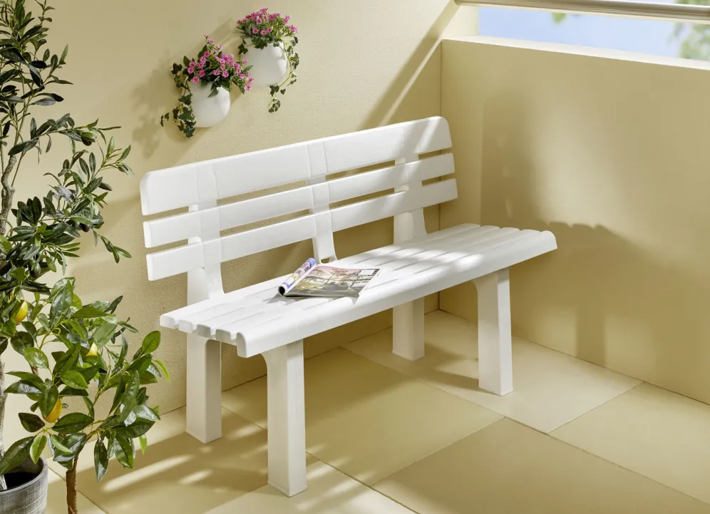 Diese kompakte Bank aus Kunststoff bietet 2 Personen Platz und ist ideal für kleine Gärten, Terrassen und Balkone. Sie ist witterungsbeständig, pflegeleicht und belastbar bis 200 kg. Mit Aufbau-Anleitung.