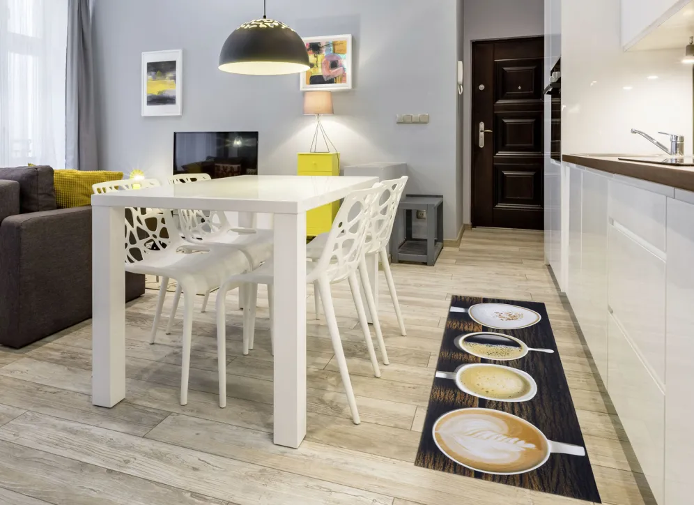 Ein echter Wachmacher ist dieser Küchenläufer mit Kaffeetassen. Durch das tolle Design und der schönen Farbgebung wird er ein echter Hingucker in Ihrer Küche werden. Falls einmal Flecken auf dem Läufer sein sollten, können Sie diese einfach mit einem feuchten Tuch abwischen. Außerdem ist er strapazierfähig und mit rutschhemmendem Rücken ausgestattet. Gesamthöhe: ca. 3 mm. Maße: 50×150 cm. Die Qualität: 100% Polyvinylchlorid (PVC).