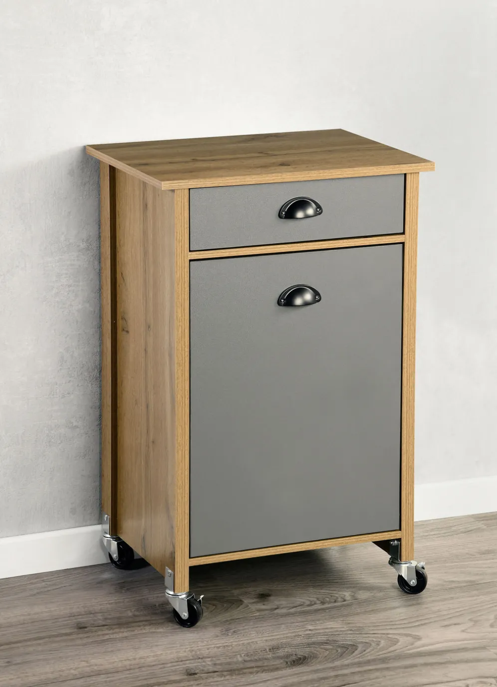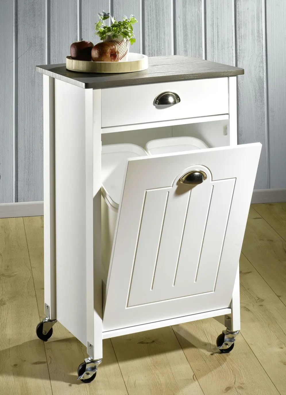 Küchenwagen. Mit 1 großen Klappe, mit 2 Müllbehältern, 1 praktischen Schublade sowie grauer Ablage-/Arbeitsfläche oben. Auf 4 vollbeweglichen Lenkrollen mit 2 Feststellbremsen, daher überall einsatzbereit. Maße: B50xH79xT37 cm