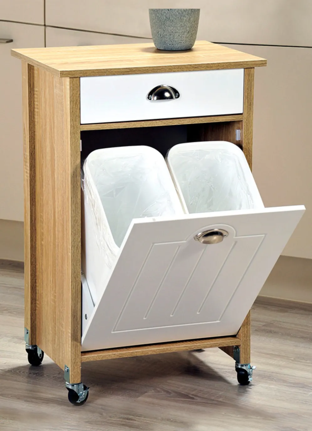 Innovative Küchenmöbel mit Mülltrennsystem. Mit jeweils 2 herausnehmbaren Müllbehältern (Maße: je B18,5xT24,5xH34 cm, Inhalt: je 15 l). Aus Holzwerkstoffen gefertigt. Mit Aufbau-Anleitung