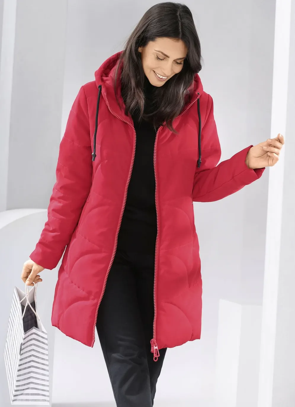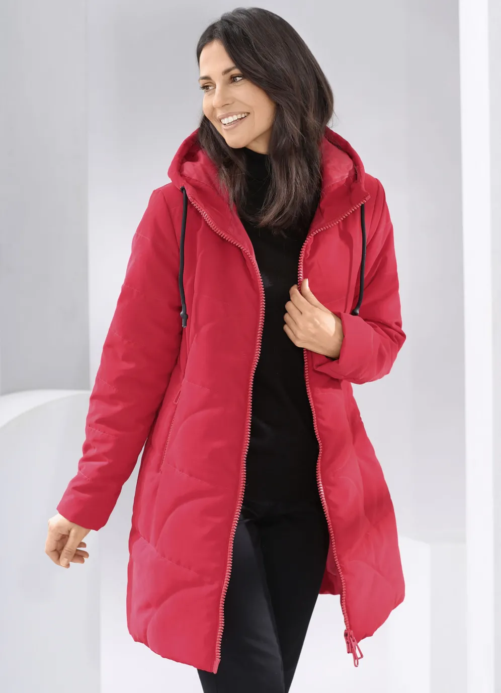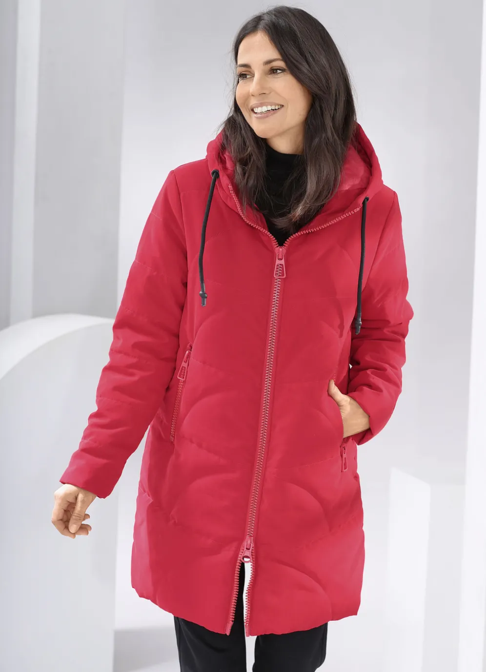 Dieser modische, rote Kurzmantel ist die richtige Wahl: feste Kapuze mit Durchzugsband, durch 2-Wege-Reißverschluss hoch schließbarer Stehkragen, Reißverschlusstaschen sowie eine Innentasche. Länge ca. 88 cm.