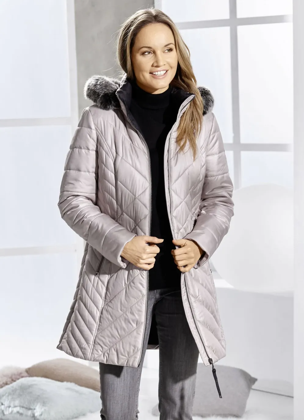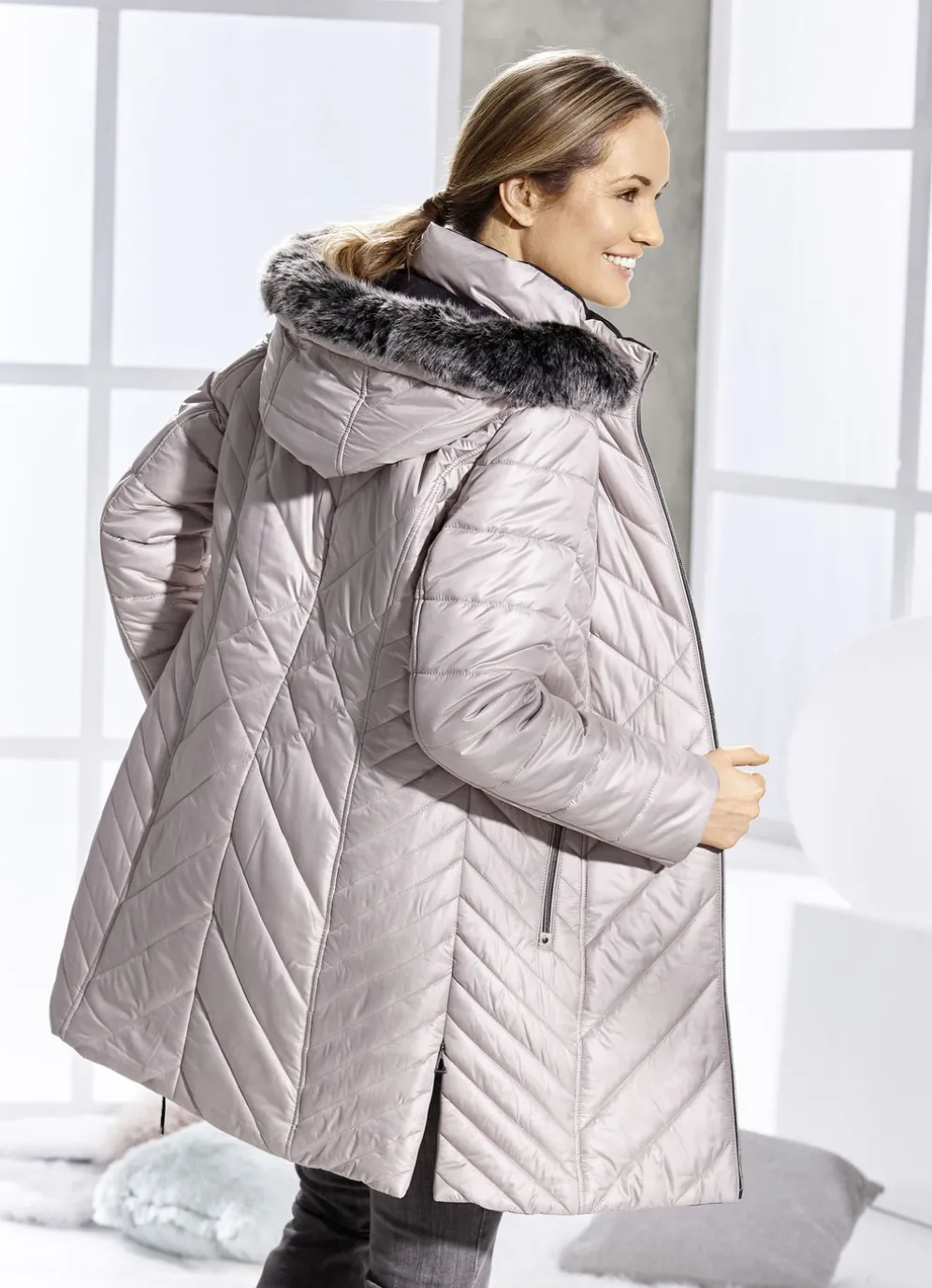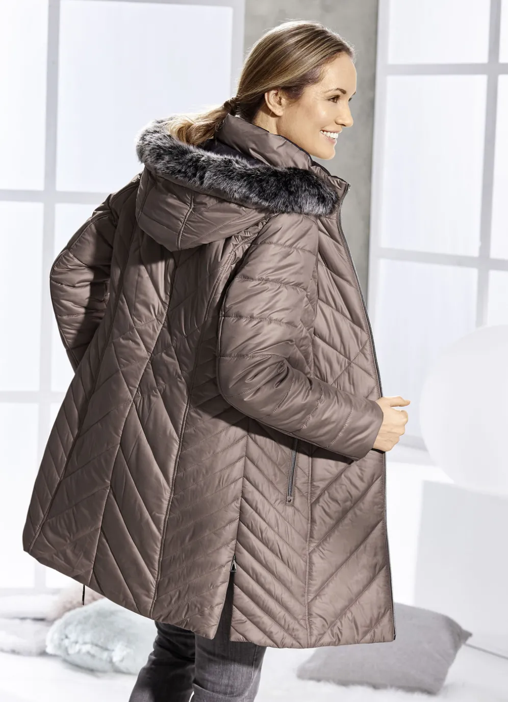 - abnehmbare Kapuze mit Durchzugsband, Stopper und abnehmbarem Kunstpelz-Besatz