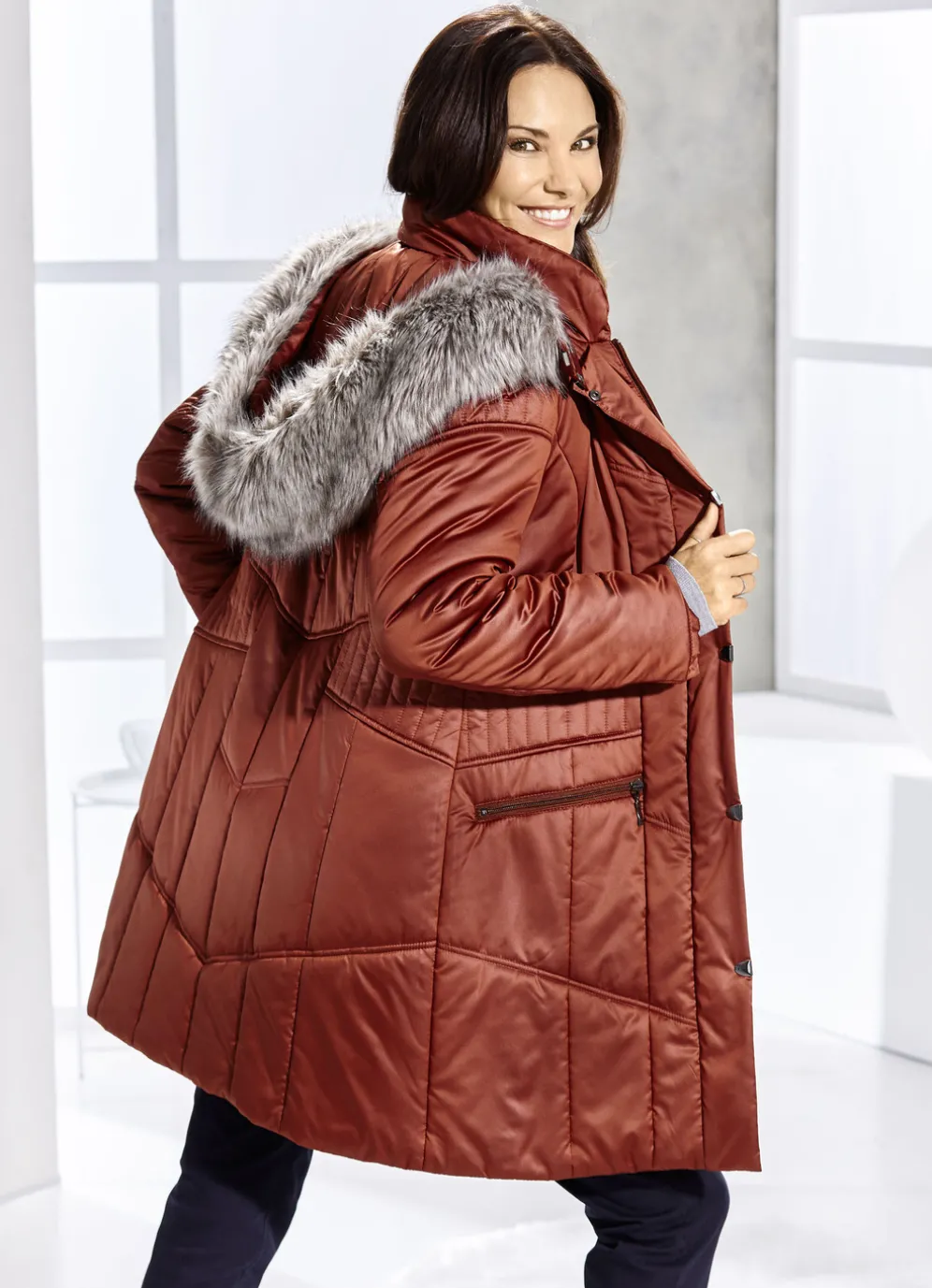 Kurzmantel mit abnehmbarem Kunstpelz-Besatz in Terra und in Größe 36.