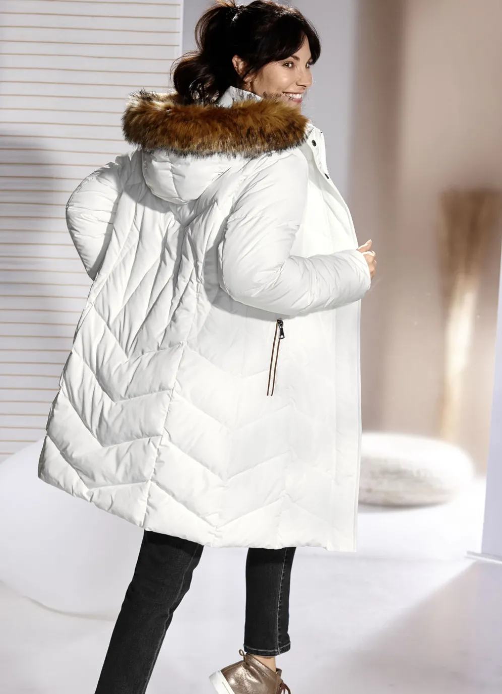 Traumhafter Kurzmantel in Naturweiß mit abnehmbarem Kunstpelz-Besatz an der abnehmbaren Kapuze, durch 2-Wege-Reißverschluss unter der verdeckten Druckerleiste hoch schließbarem Stehkragen, Taschen mit Reißverschluss, Windfangärmeln aus Rippenstrick sowie einer Innentasche. Länge ca. 90 cm. Die Qualität: Microfaser, Taftfutter und Watte jeweils aus 100% Polyester; Kunstpelz aus 80% Polyacryl und 20% Polyester. Waschbar