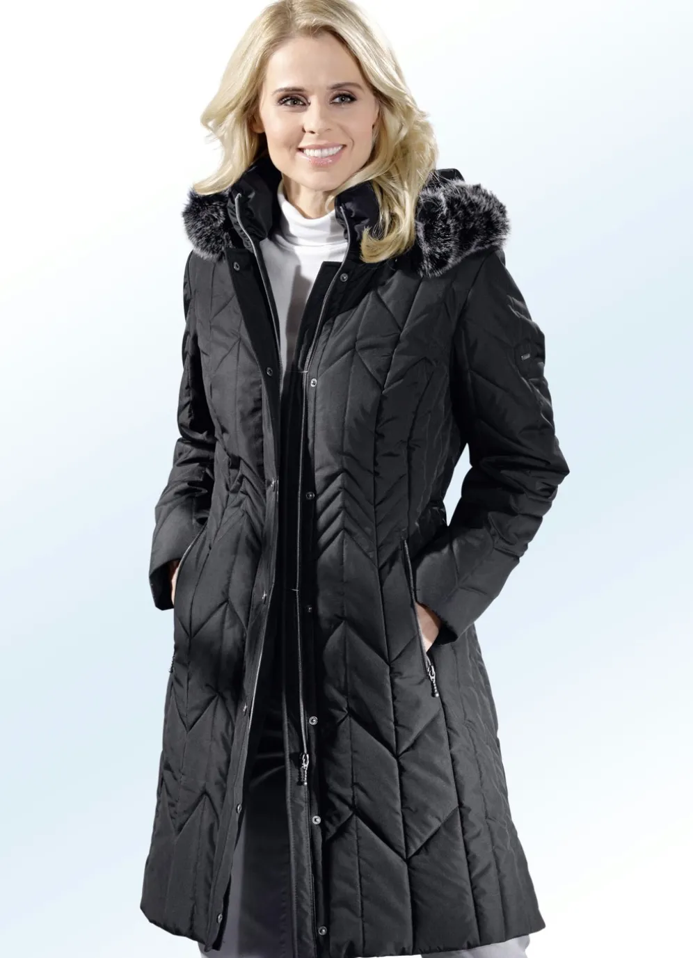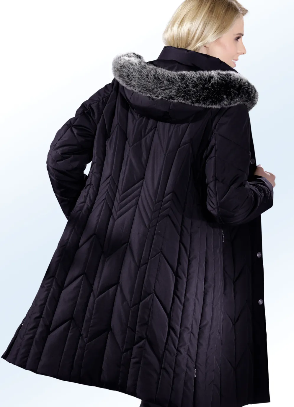 Fabelhafter Kurzmantel in leicht ausgestellter Form: abnehmbarer Kunstpelz-Besatz an der abnehmbaren Kapuze mit Durchzugsband und Stopper, durch Reißverschluss unter der Druckerleiste hoch schließbarer Stehkragen, Reißverschlüsse an den Nahttaschen und Seitenschlitzen, umschlagbare Ärmel sowie eine Innentasche. Länge ca. 95 cm.