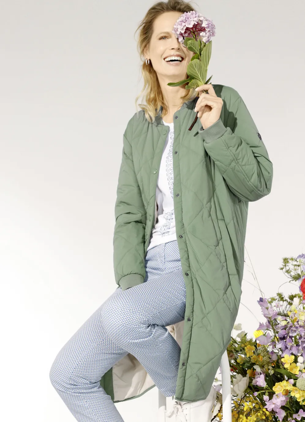 Leicht taillierter Kurzmantel mit rundem Halsausschnitt, Druckerleiste, Rippbündchen an den langen Ärmeln, Schubtaschen sowie komfortablen Druckern an den Seitenschlitzen. Länge ca. 106 cm.