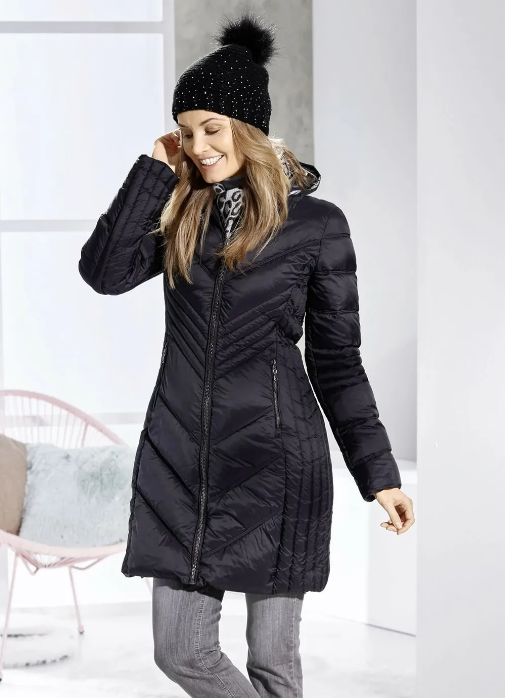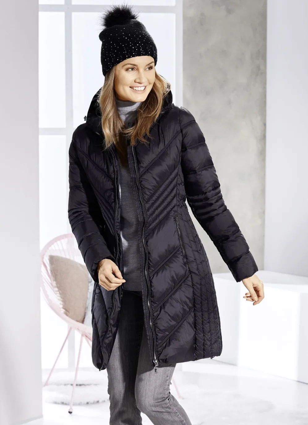 Schwarzer Kurzmantel mit seitlich figurgünstiger Längssteppung: feste Kapuze mit Durchzugsband und Stopper, Reißverschlussleiste, Taschen mit Reißverschluss sowie Windfangärmel aus Rippenstrick. Länge ca. 90 cm.