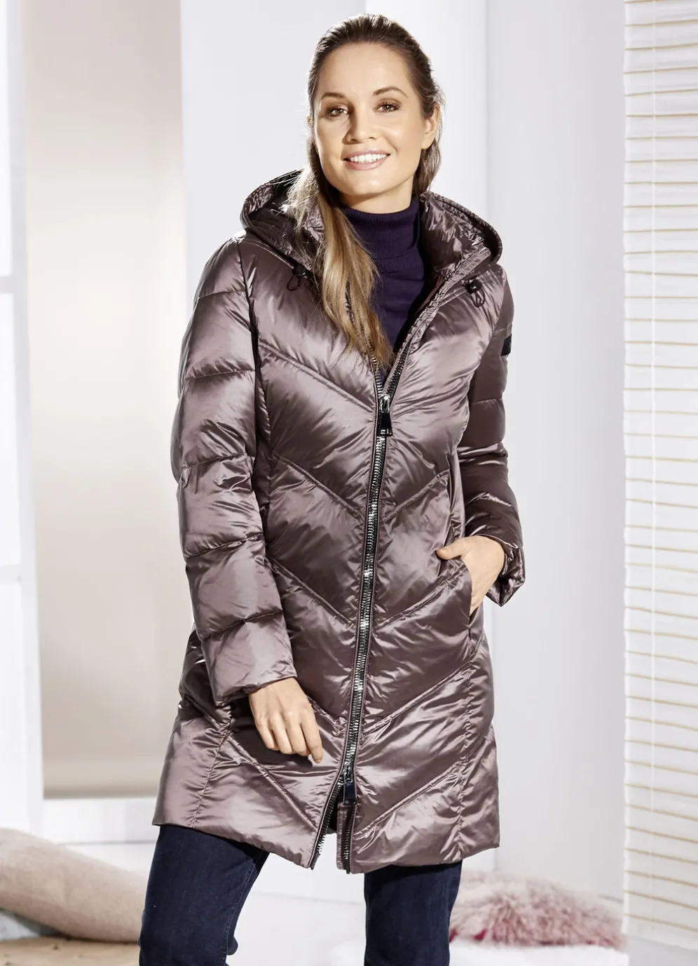 Faszinierender Kurzmantel in Mauve: feste Kapuze mit Durchzugsband und Stopper, durch 2-Wege-Reißverschluss hoch schließbarer Stehkragen, nahtfeine Reißverschlusstaschen, umschlagbare Ärmel sowie eine Innentasche. Länge ca. 90 cm.
