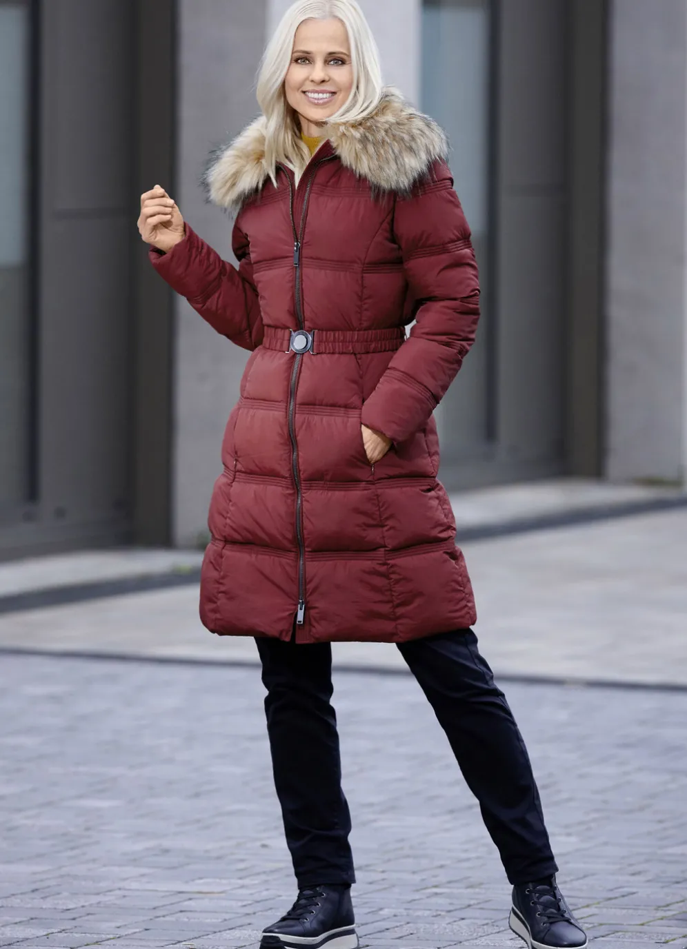 Umwerfender Kurzmantel: durch 2-Wege-Reißverschluss hoch schließbarer Kragen mit abnehmbarem Kunstpelz-Besatz, Gürtelschlaufen, Gürtel sowie nahtfeine Reißverschlusstaschen. Länge ca. 98 cm.