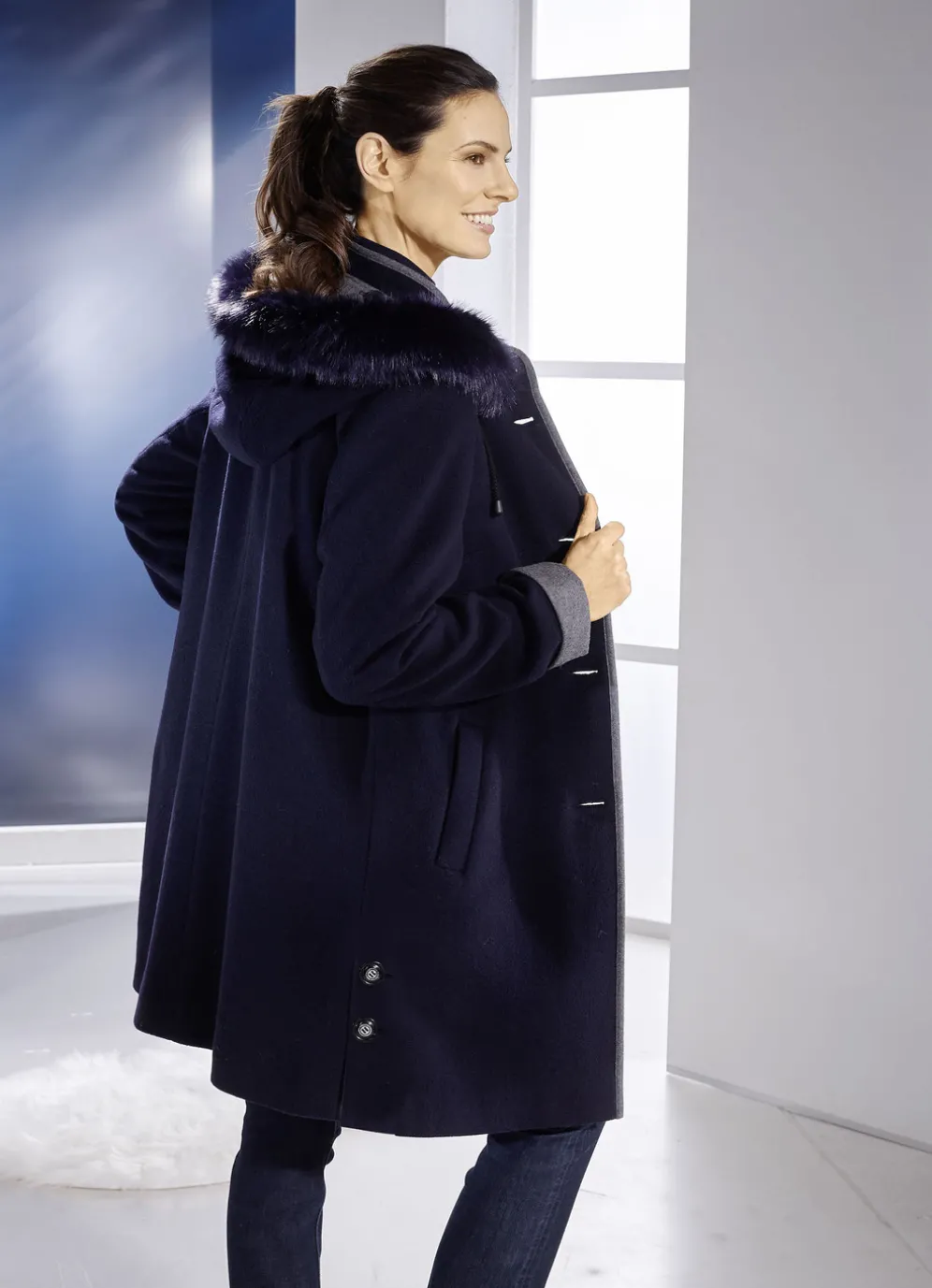 Große Klasse ist dieser herrliche, blaue Kurzmantel mit hohem Tragekomfort: abnehmbare Kapuze mit Durchzugsband, Stopper, Flanell-Innenausstattung und abnehmbarem Kunstpelz-Besatz, hoch schließbarer Stehkragen, Knopfleiste, Schubtaschen mit Blende, Umschlagärmel in Kontrast, Knöpfe an den Seitenschlitzen sowie eine Innentasche. Länge ca. 93 cm