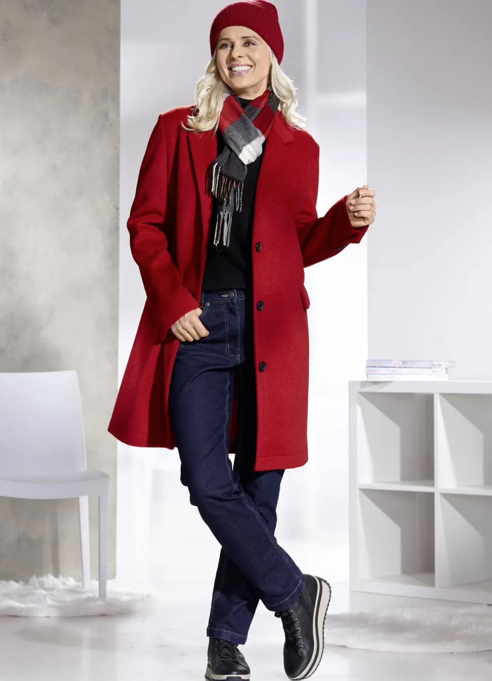 Kurzmantel mit Reverskragen in Karminrot und in Größe 38.