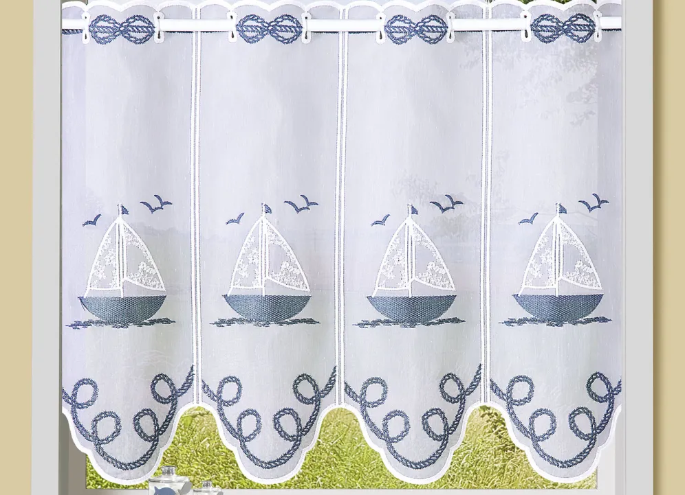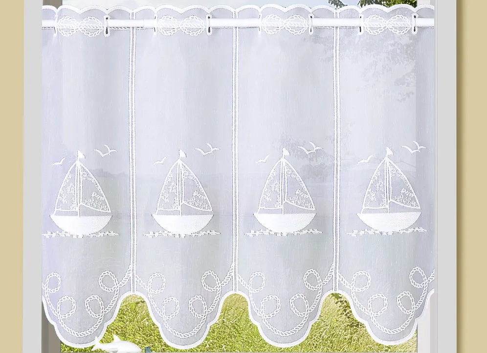 Nautisch dessinierter Kurzstore, der Sie mit seinen herzigen Boot-Motiven begeistern wird. Mit Stangendurchzug sowie gebogten Abschlüssen gearbeitet. Die Qualität: bestickter Batist aus 100% Polyester.