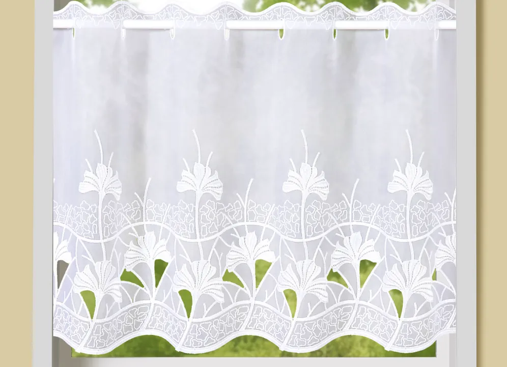 Diese Kurzstore mit ansprechendem Ginko-Motiv, echter Plauener Stickerei, gebogtem Abschluss und Stangendurchzug sorgt für spürbar mehr Wohnlichkeit. Die Qualität: 100% Polyester