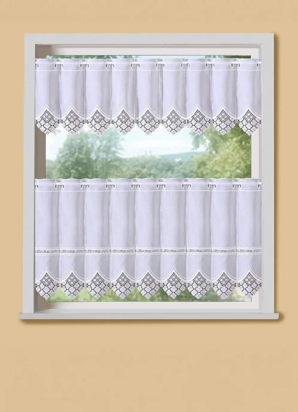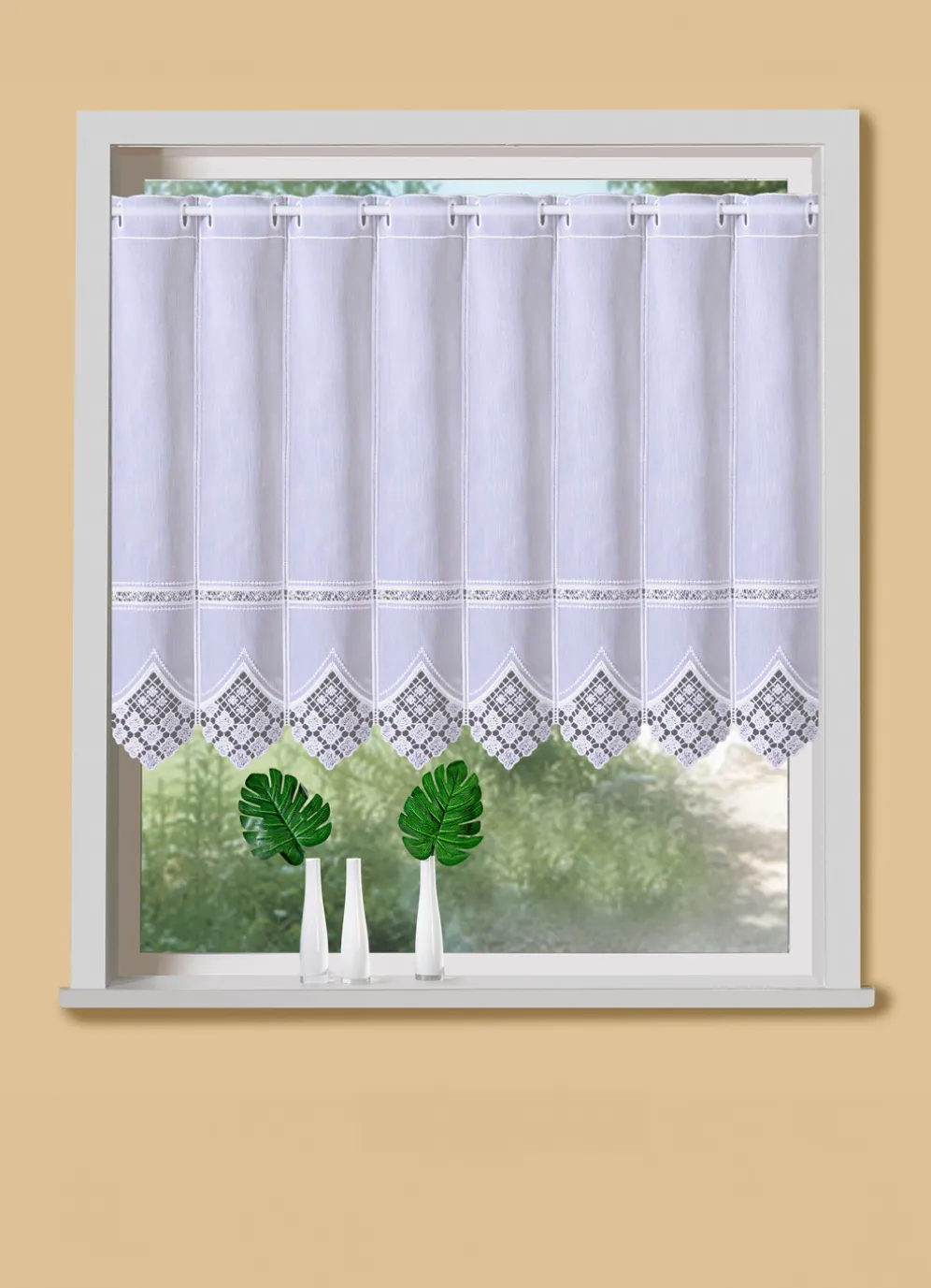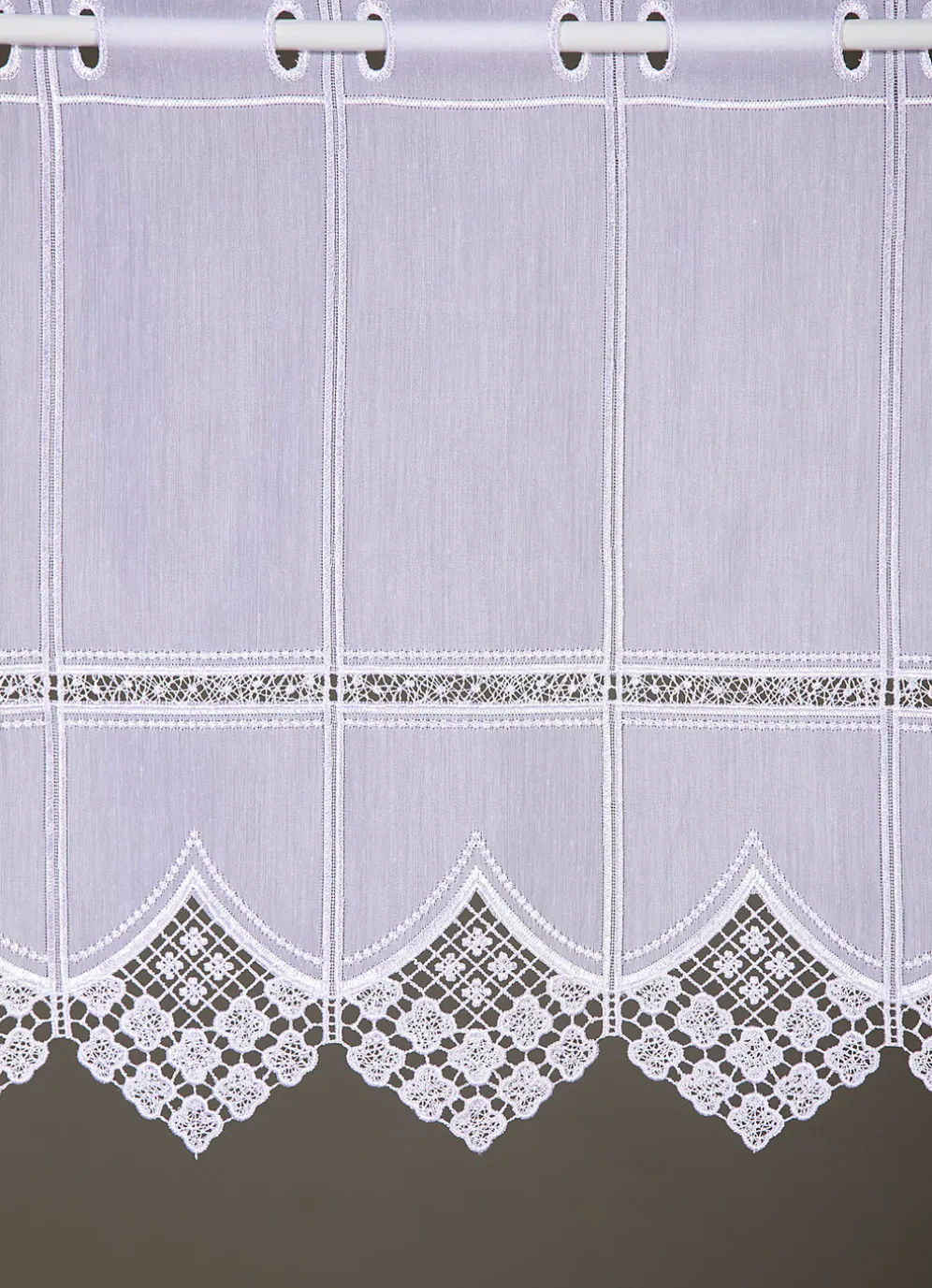 Kurzstore mit edler Macramé-Spitze und Stangendurchzug in Größe 661 (H30xB 90 cm) und in Weiss.
