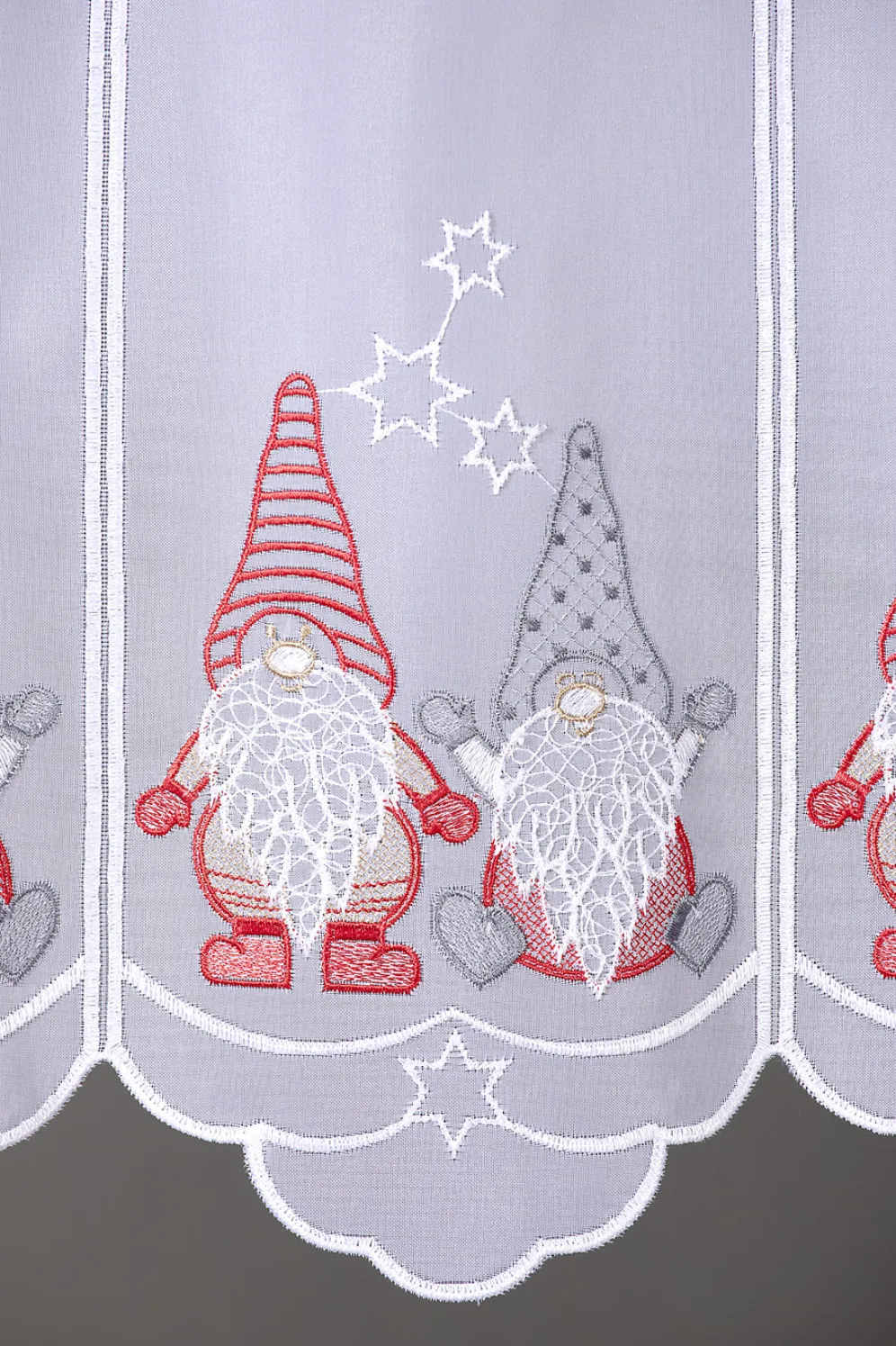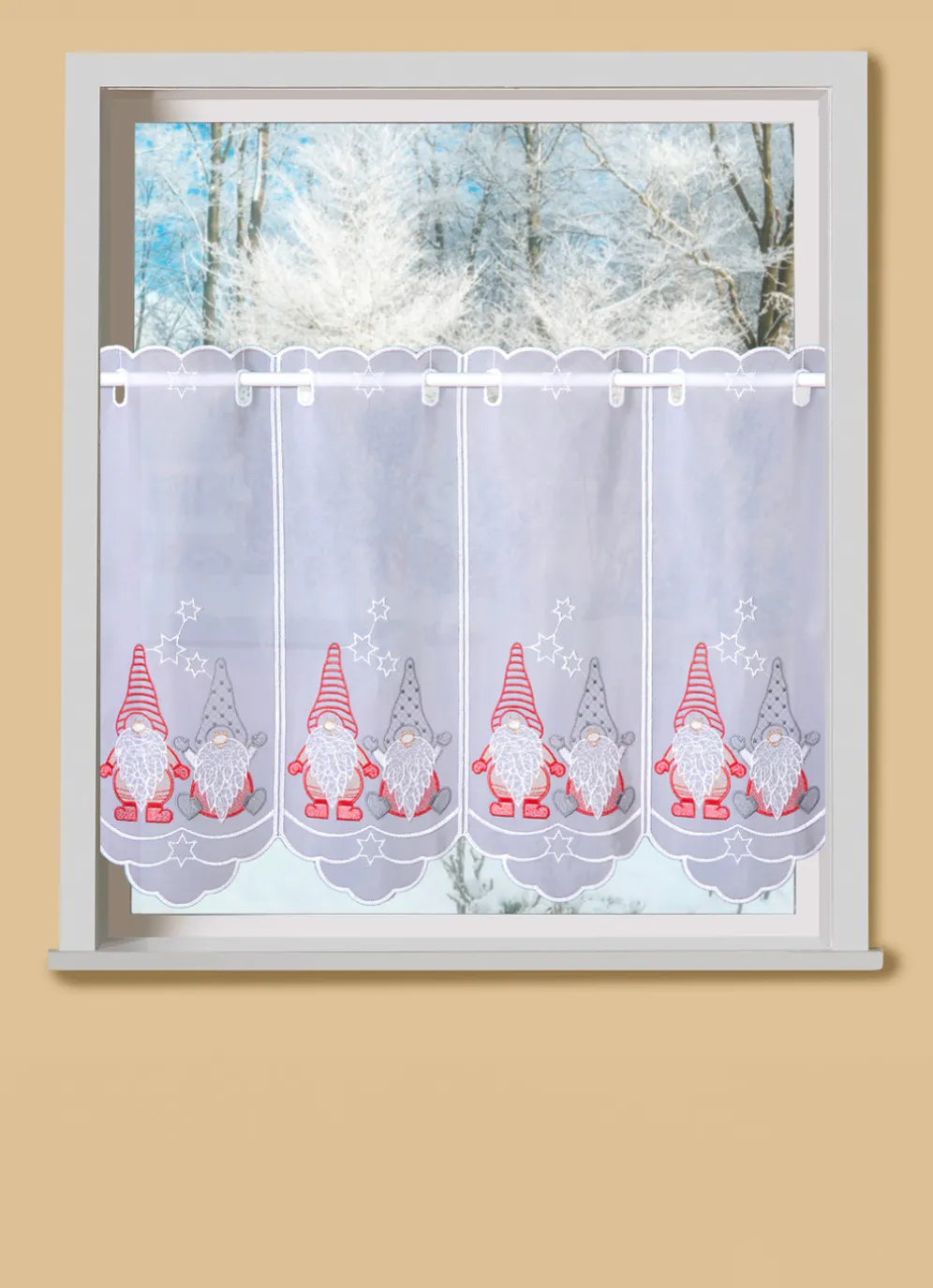 Mit seinen lustigen Weihnachts-Wichteln ist dieser Kurzstore der perfekte Fensterschmuck für die Adventszeit. Mit echter Plauener Stickerei, Stangendurchzug und gebogtem Abschluss. Voile aus 100% Polyester.