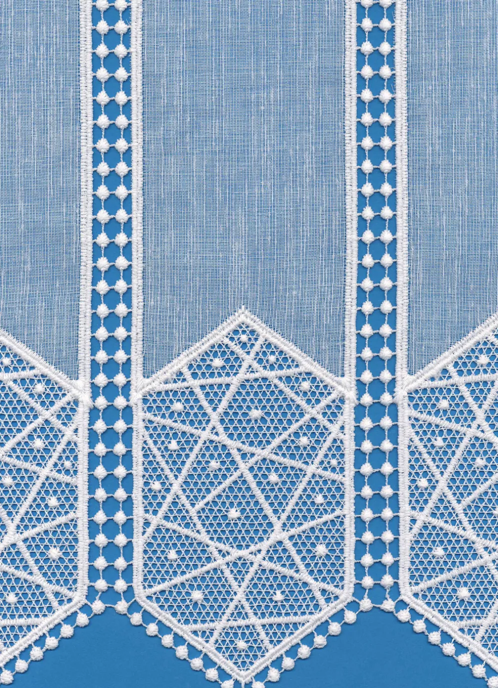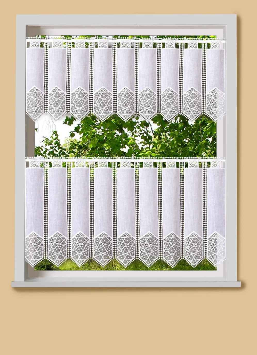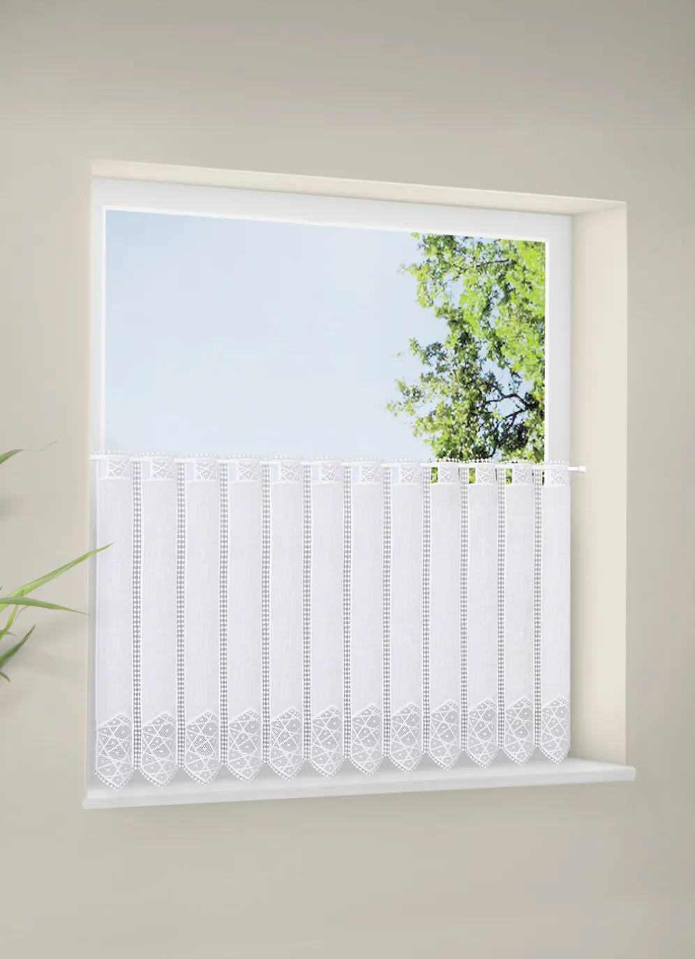 Toller Kurzstore „Grafik“. Mit Stangendurchzug gefertigt. Qualität: Macramé-Spitze, 100% Polyester.