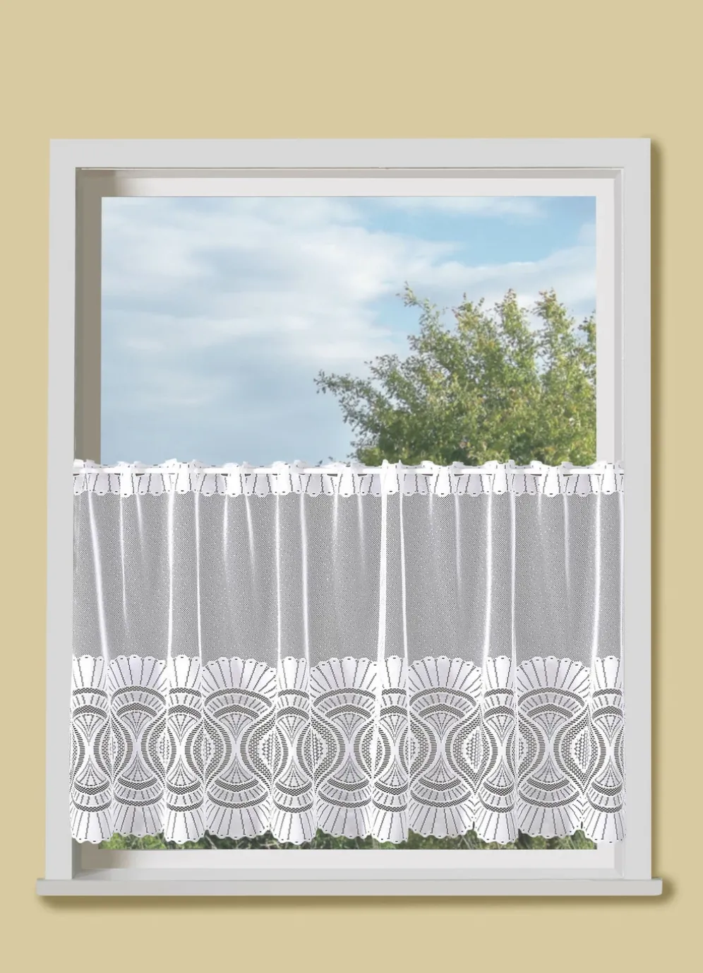 Herrlicher Kurzstore für Ihr Zuhause. Mit gebogtem Abschluss und Stangendurchzug gearbeitet. Die Qualität: Jacquard aus 100% Polyester