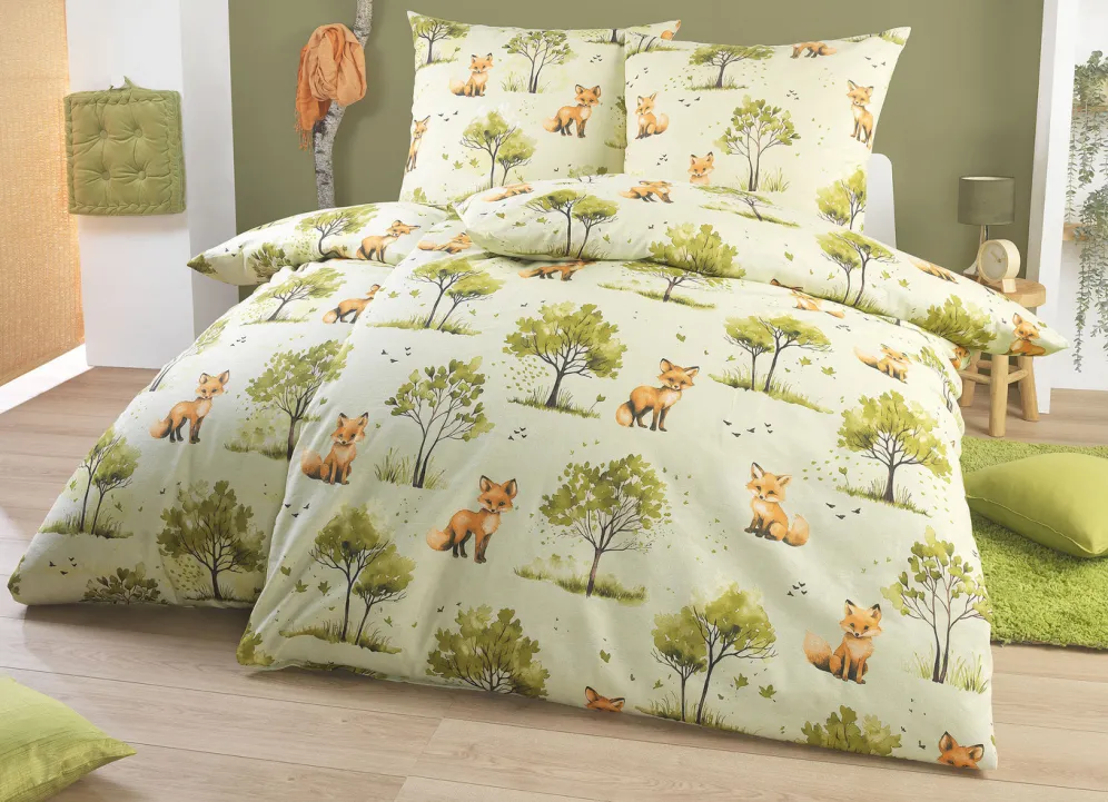 Viele kleine, niedliche Füchse sind inmitten grüner Bäume auf dieser wunderbar kuscheligen Bettwäsche-Garnitur von „Dobnig“ unterwegs. Mit praktischem Reißverschluss. Die wärmende Qualität: Biber aus 100% Baumwolle. Waschbar bis 60 °C und trocknergeeignet