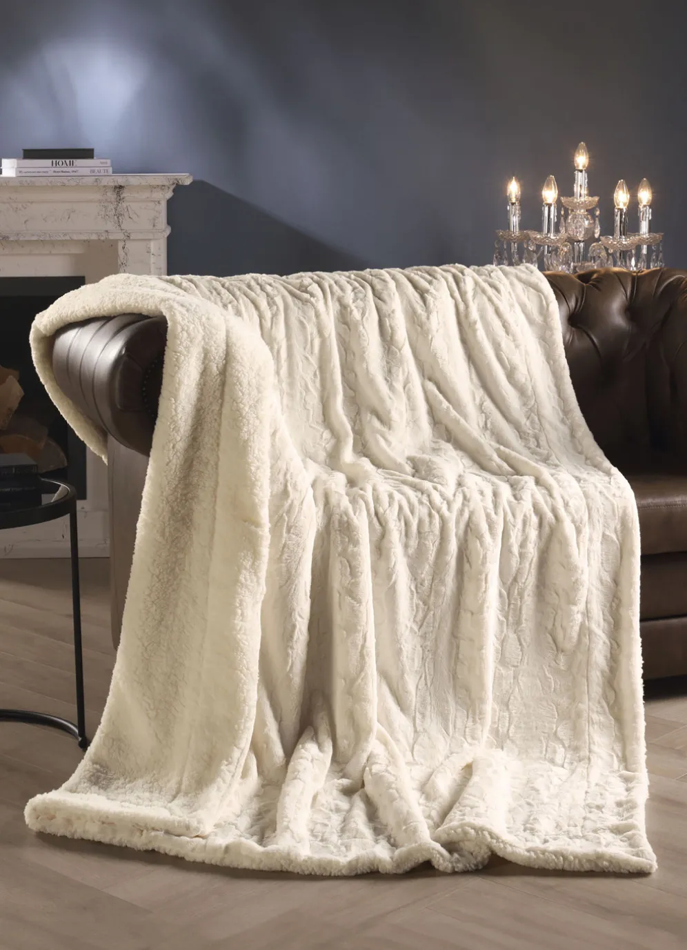 Kuschelige Wohndecke aus Webpelz-Fellimitat in Größe 225 (150×200 cm) und in Creme.
