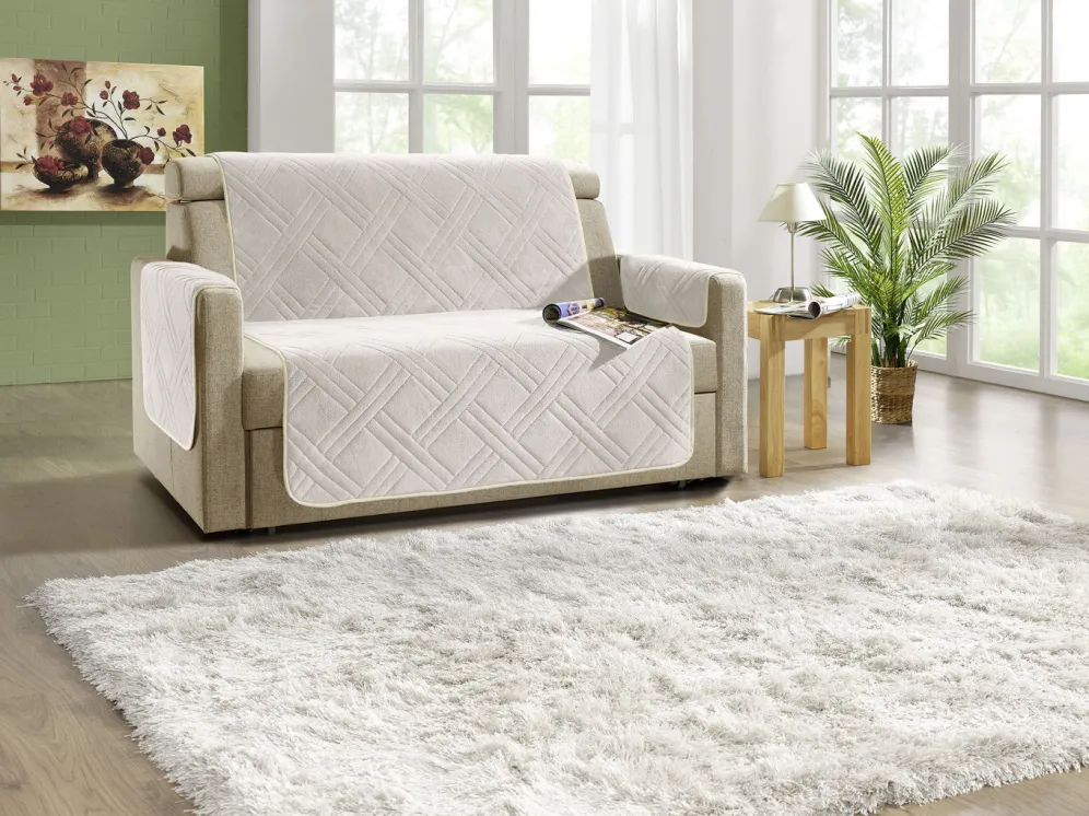 Kuschelweiche Wohnaccessoires mit Bandeinfassung in Größe 865 (2x Armlehnenschoner, 45x 70 cm) und in Beige.