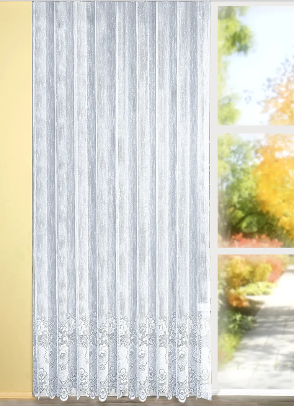 Weißer, dessinierter Langstore, auch für die Balkontür geeignet. Mit Faltenband. Bestellen Sie deshalb die 3-fache Leisten/Deko-Breite. 100% Polyester/„Trevira“. Nach Ökotex-Standard 100