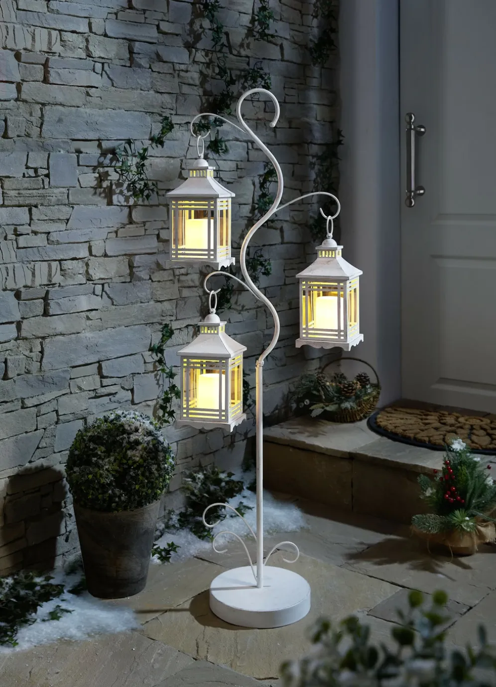 Erleuchten Sie Ihre Umgebung mit diesem eleganten Laternen-Baum! Die 3 hängenden Laternen am dekorativen Ständer verleihen Ihrem Außenbereich festliche Stimmung. Jede Laterne ist mit einer großen LED-Kerze ausgestattet, die eine einladenden Atmosphäre schafft. Maße: Gesamthöhe ca. 130 cm. Laterne: B14 H20,5 T14 cm