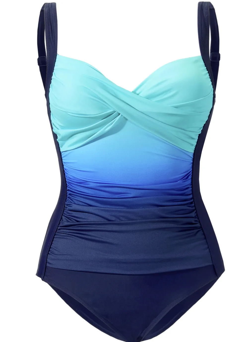 Hübscher, marinefarbener „Laurina“-Badeanzug mit buntem, gerafftem Vorderteileinsatz, leicht verschlungenem Büstenteil, verstellbaren Trägern, Halbkorsage, Softschalen und Unterbrustband.