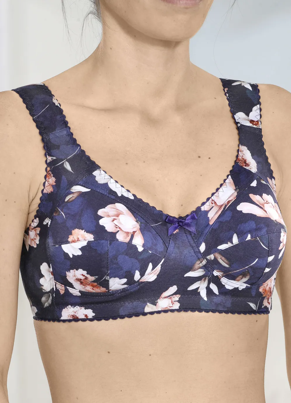 Marinefarbener „Laurina“-BH mit farbharmonischem Floraldessin, unterlegtem Vorderteil sowie breiten, im Schulterbereich weich gepolsterten, verstellbaren Stretchträgern.