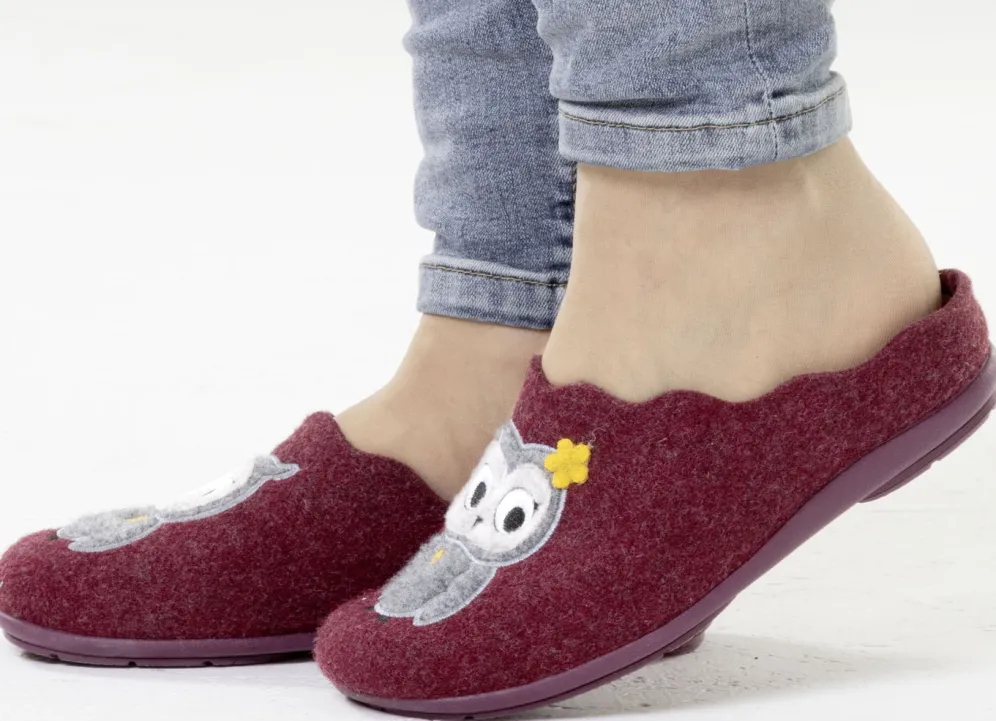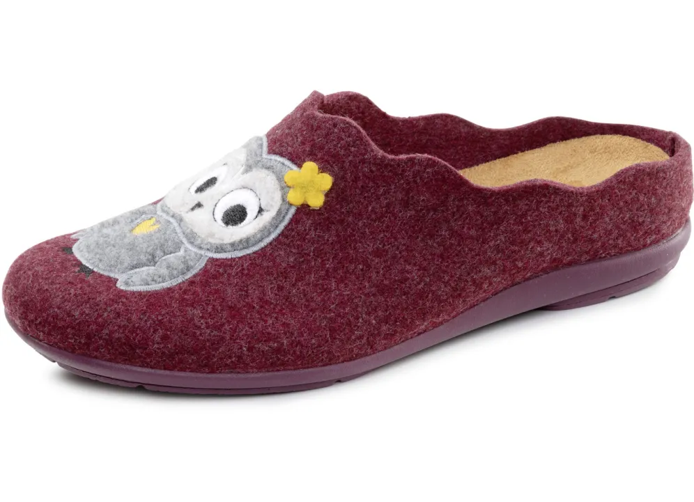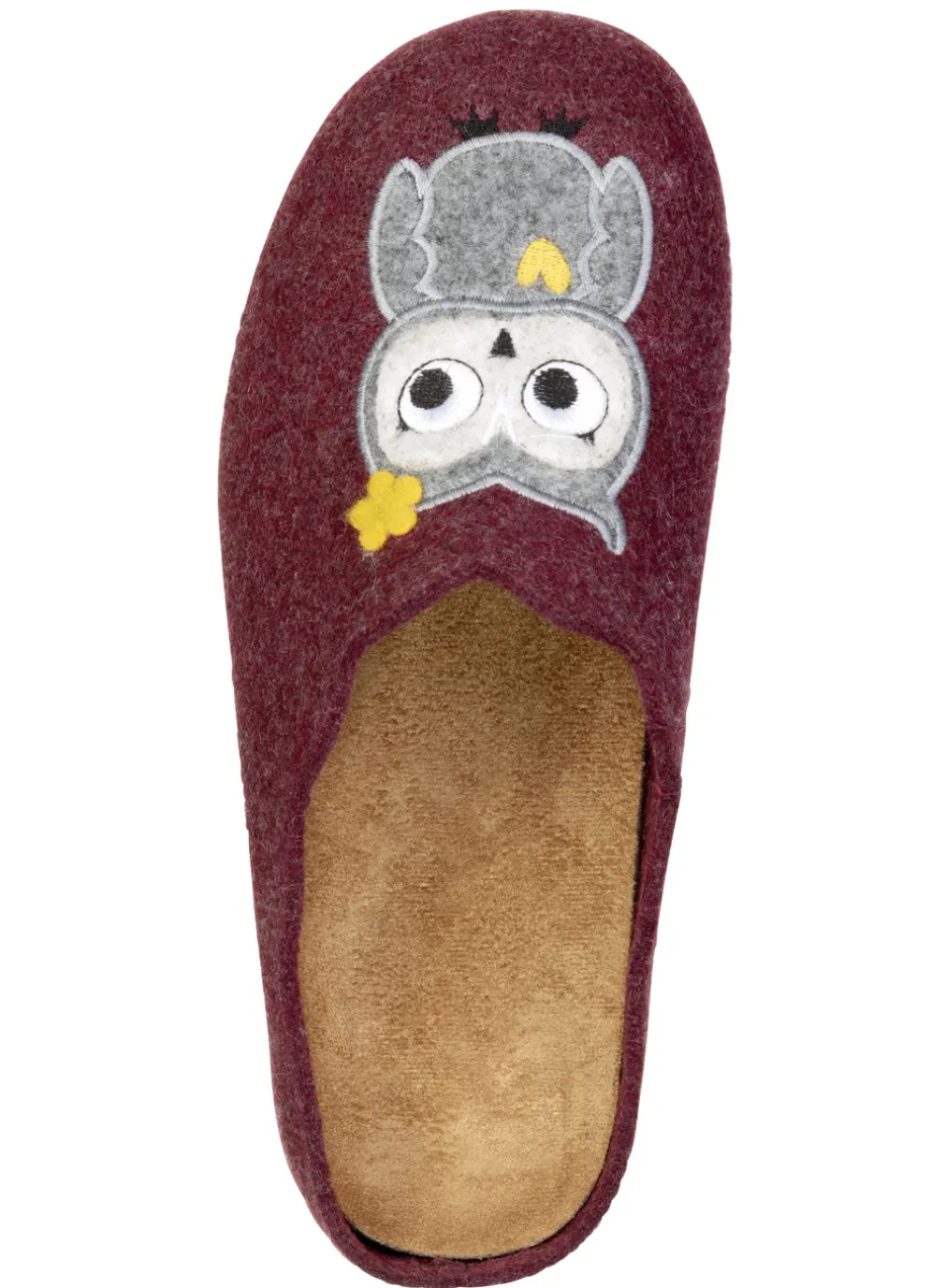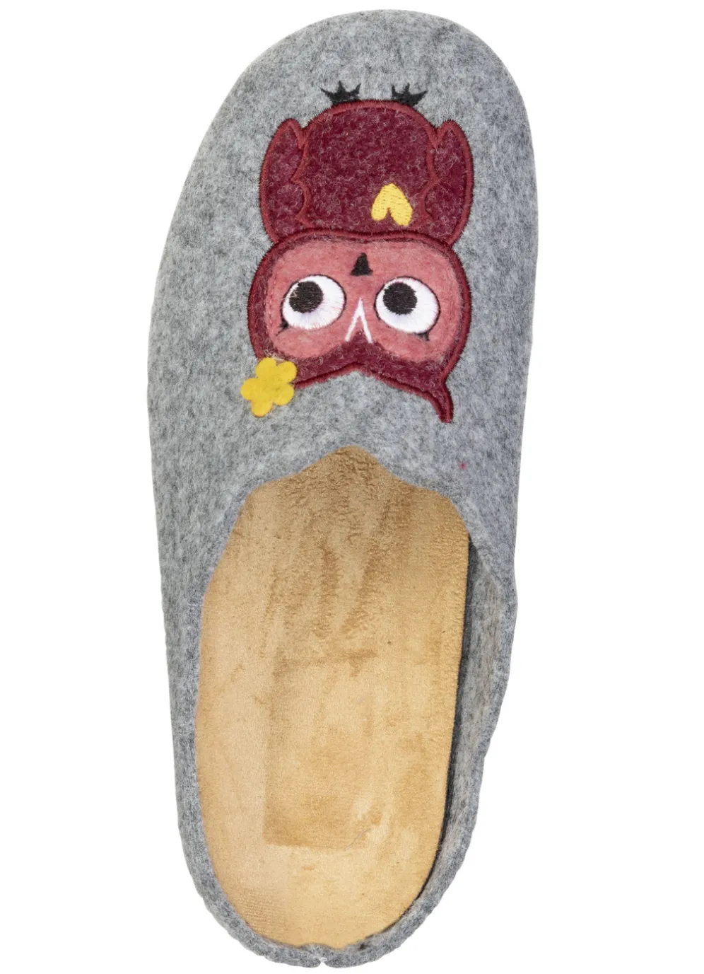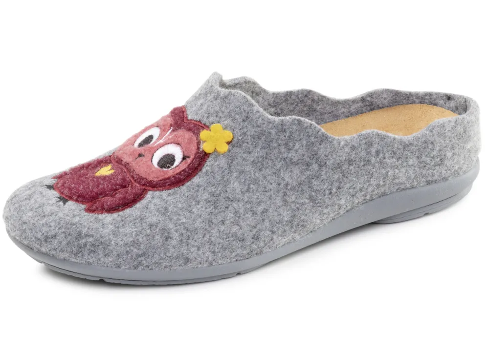 Hausschuhe von „Laurina“, aus Filz mit niedlicher Eulen-Applikation: herausnehmbares Textil-Fußbett, superleichte Gummi-Laufsohle sowie 10 mm Keilabsatz