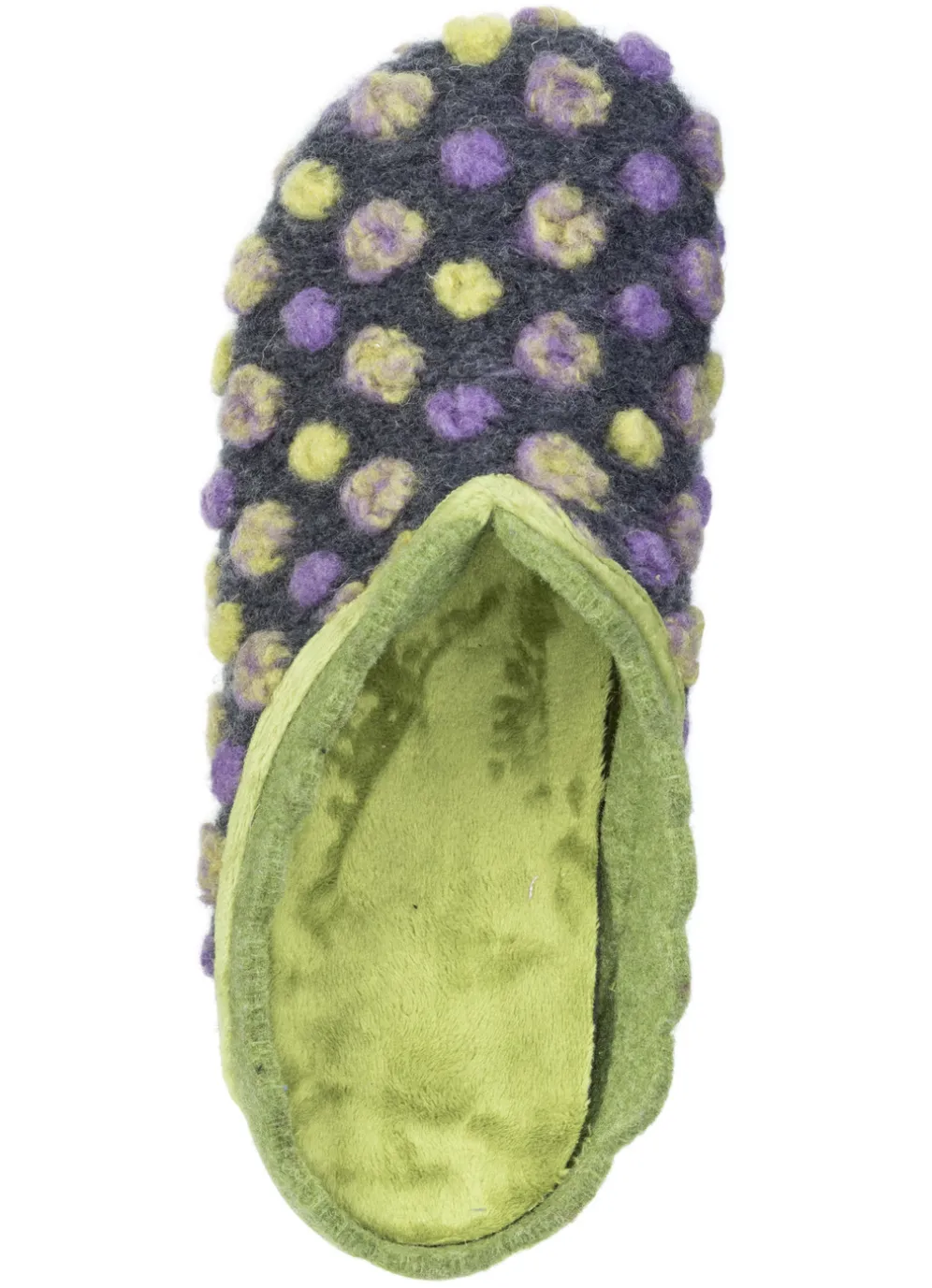 Hausschuhe von „Laurina“, aus Filz mit Pünktchen-Dessin: Textilfutter, herausnehmbares Fußbett, leichte Gummi-Laufsohle sowie 10 mm Keilabsatz