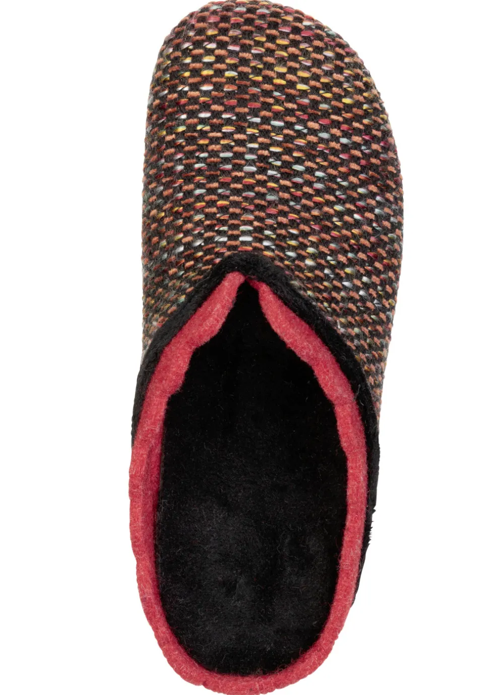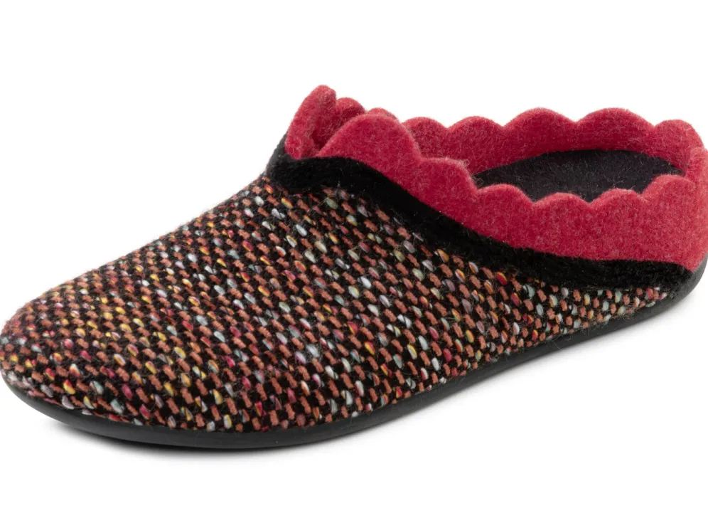 Hausschuhe von „Laurina“, in Schwarz-Rot-Bunt aus interessantem Textil-Materialmix: Futter und herausnehmbares Fußbett aus recyceltem Polyester sowie superleichte Gummi-Laufsohle