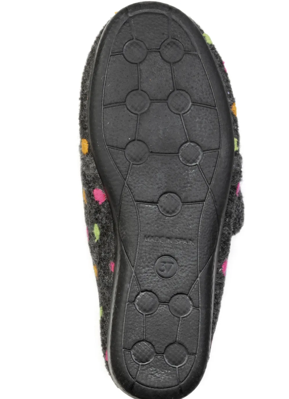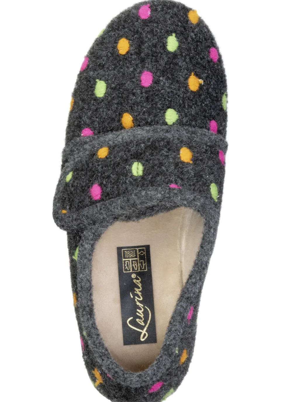 Hausschuhe von „Laurina“, aus Filz mit bunter Pünktchen-Stickerei: Klettverschluss, Futter und gepolsterte Decksohle aus weichem Samt, leichte Gummi-Laufsohle sowie 20 mm Keilabsatz